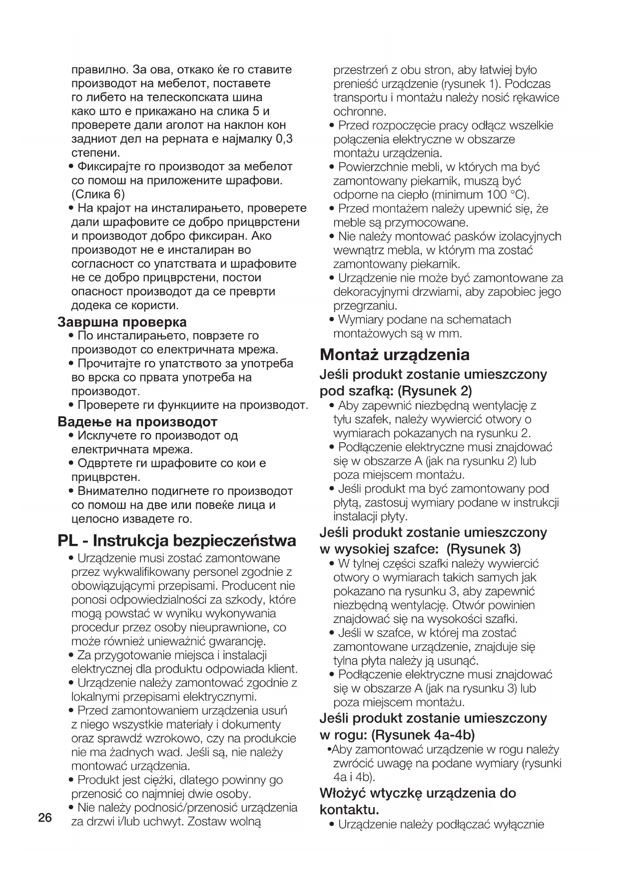 - Powierzchnie mebli, w których ma być zamontowany piekarnik, muszą być odporne na ciepło (minimum 100 °C).