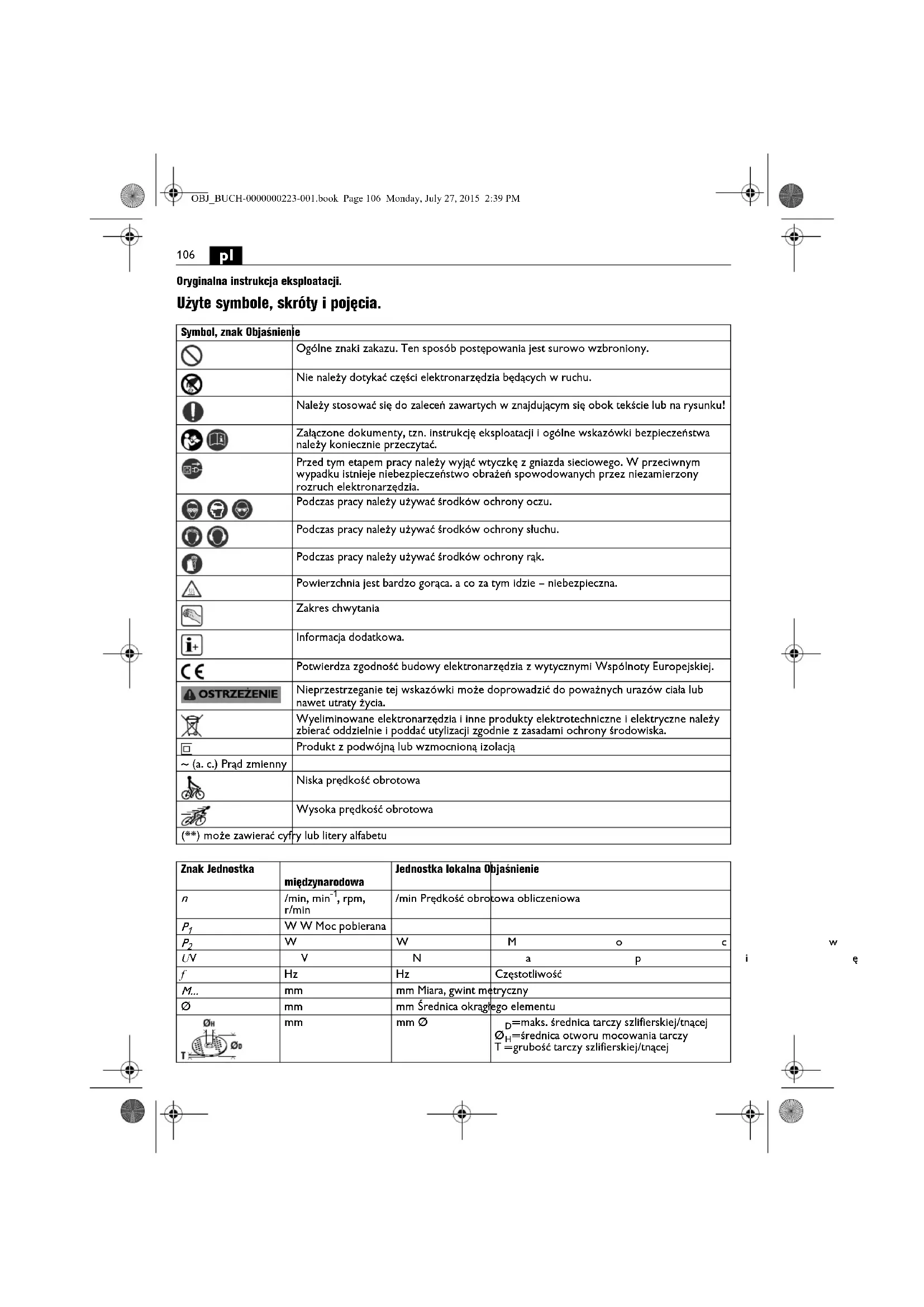 Oryginalna instrukcja eksploatacji. Użyte symbole, skróty i pojęcia. Symbol, znak Objaśnienie Ogólne znaki zakazu. Ten sposób postępowania jest surowo wzbroniony. Nie należy dotykać części elektronarzędzia będących w ruchu. Należy stosować się do zaleceń zawartych w znajdującym się obok tekście lub na rysunku! Załączone dokumenty, tzn. instrukcję eksploatacji i ogólne wskazówki bezpieczeństwa należy koniecznie przeczytać. Przed tym etapem pracy należy wyjąć wtyczkę z gniazda sieciowego. W przeciwnym wypadku istnieje niebezpieczeństwo obrażeń spowodowanych przez niezamierzony rozruch elektronarzędzia. Podczas pracy należy używać środków ochrony oczu. Podczas pracy należy używać środków ochrony słuchu. Podczas pracy należy używać środków ochrony rąk. Powierzchnia jest bardzo gorąca. a co za tym idzie – niebezpieczna. Zakres chwytania Informacja dodatkowa. Potwierdza zgodność budowy elektronarzędzia z wytycznymi Wspólnoty Europejskiej. Nieprzestrzeganie tej wskazówki może doprowadzić do poważnych urazów ciała lub nawet utraty życia. Wyeliminowane elektronarzędzia i inne produkty elektrotechniczne i elektryczne należy zbierać oddzielnie i poddać utylizacji zgodnie z zasadami ochrony środowiska. Produkt z podwójną lub wzmocnioną izolacją ~ (a. c.) Prąd zmienny Niska prędkość obrotowa Wysoka prędkość obrotowa (**) może zawierać cyfry lub litery alfabetu Znak Jednostka międzynarodowa Jednostka lokalna Objaśnienie