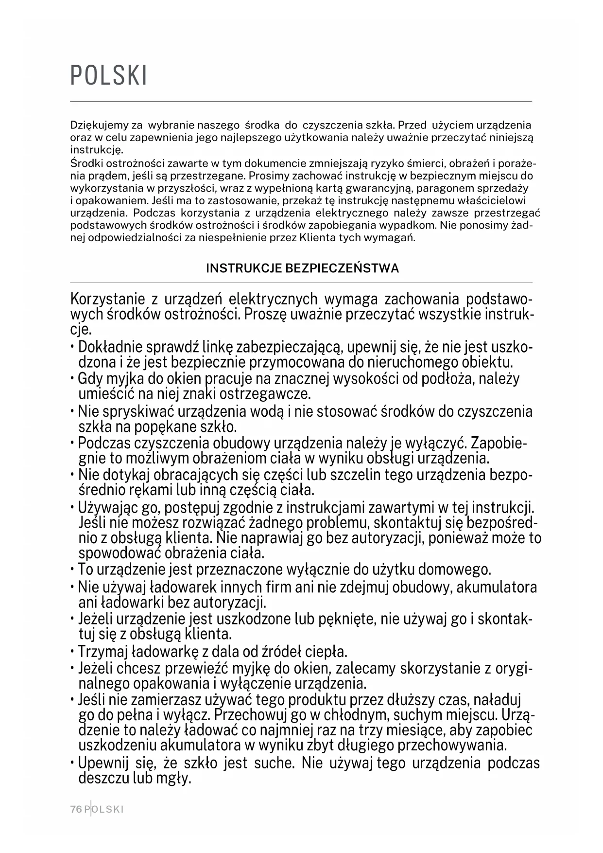- Als er geen zand of stof meer is, spuit dan meerdere keren lichtjes schoon water of afwasmiddel op de dweil of het glas, zonder deze te nat te maken.76 POLSKI POLSKI Dziękujemy za wybranie naszego środka do czyszczenia szkła. Przed użyciem urządzenia oraz w celu zapewnienia jego najlepszego użytkowania należy uważnie przeczytać niniejszą instrukcję. Środki ostrożności zawarte w tym dokumencie zmniejszają ryzyko śmierci, obrażeń i poraże- nia prądem, jeśli są przestrzegane. Prosimy zachować instrukcję w bezpiecznym miejscu do wykorzystania w przyszłości, wraz z wypełnioną kartą gwarancyjną, paragonem sprzedaży i opakowaniem. Jeśli ma to zastosowanie, przekaż tę instrukcję następnemu właścicielowi urządzenia. Podczas korzystania z urządzenia elektrycznego należy zawsze przestrzegać podstawowych środków ostrożności i środków zapobiegania wypadkom. Nie ponosimy żad- nej odpowiedzialności za niespełnienie przez Klienta tych wymagań.