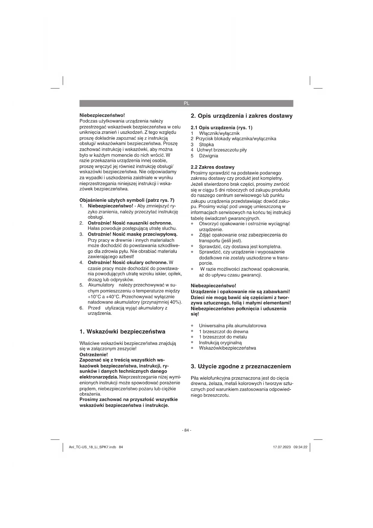 Piła wielofunkcyjna przeznaczona jest do cięcia drewna, żelaza, metali kolorowych i tworzyw sztu- cznych pod warunkiem zastosowania odpowied- niego brzeszczotu. Anl_TC-US_18_Li_SPK7.indb 84Anl_TC-US_18_Li_SPK7.indb 84 17.07.2023 09:34:2217.07.2023 09:34:22PL