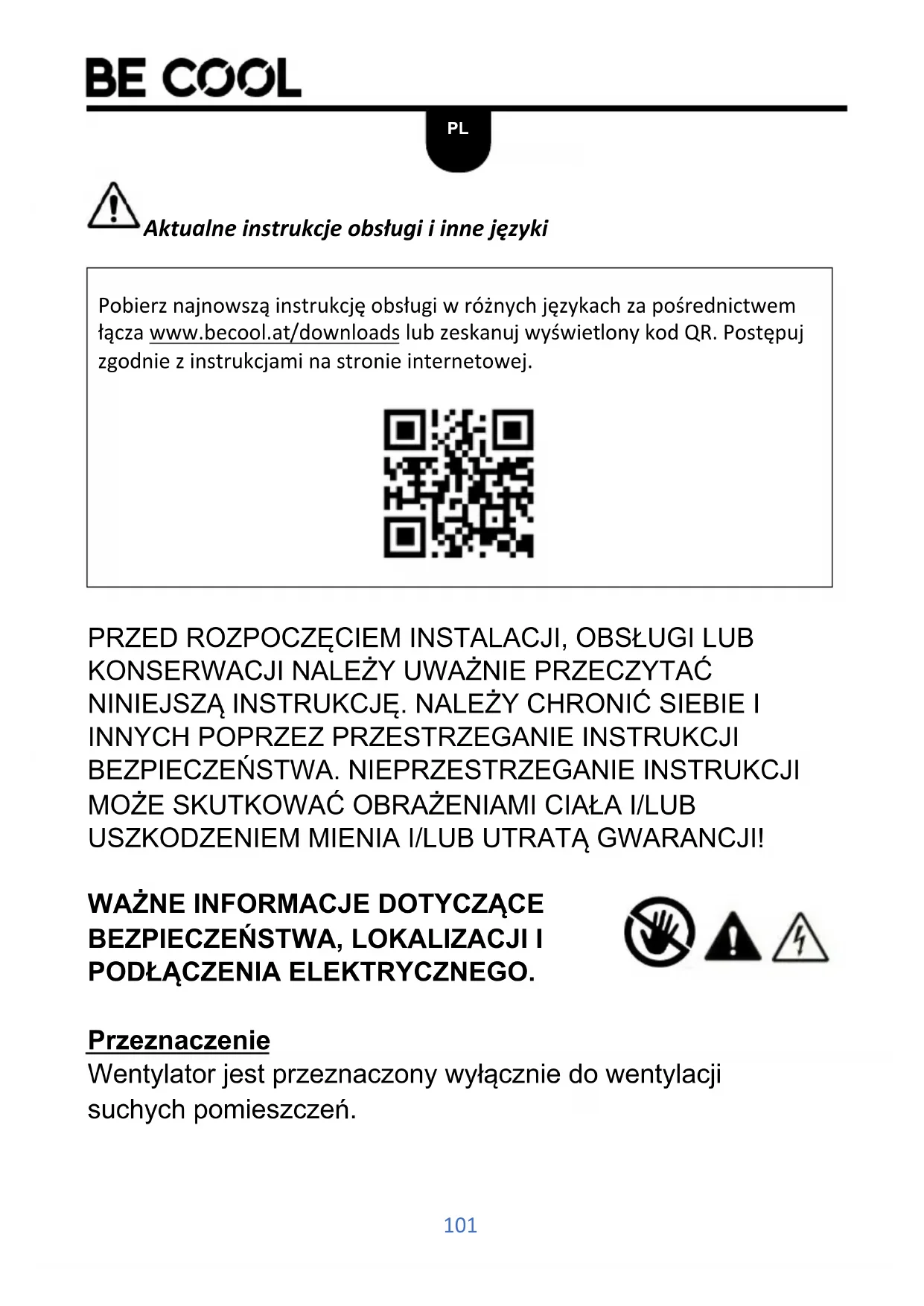 Pobierz najnowsza instrukcje obsfugi w rożnych jejzykach za posrechnictwemźacza www.becool.at/downloads lub zeskanuj wyświetlony kod QR. Postepuj zgodnia z instrukcjami na stronie internetowej.
