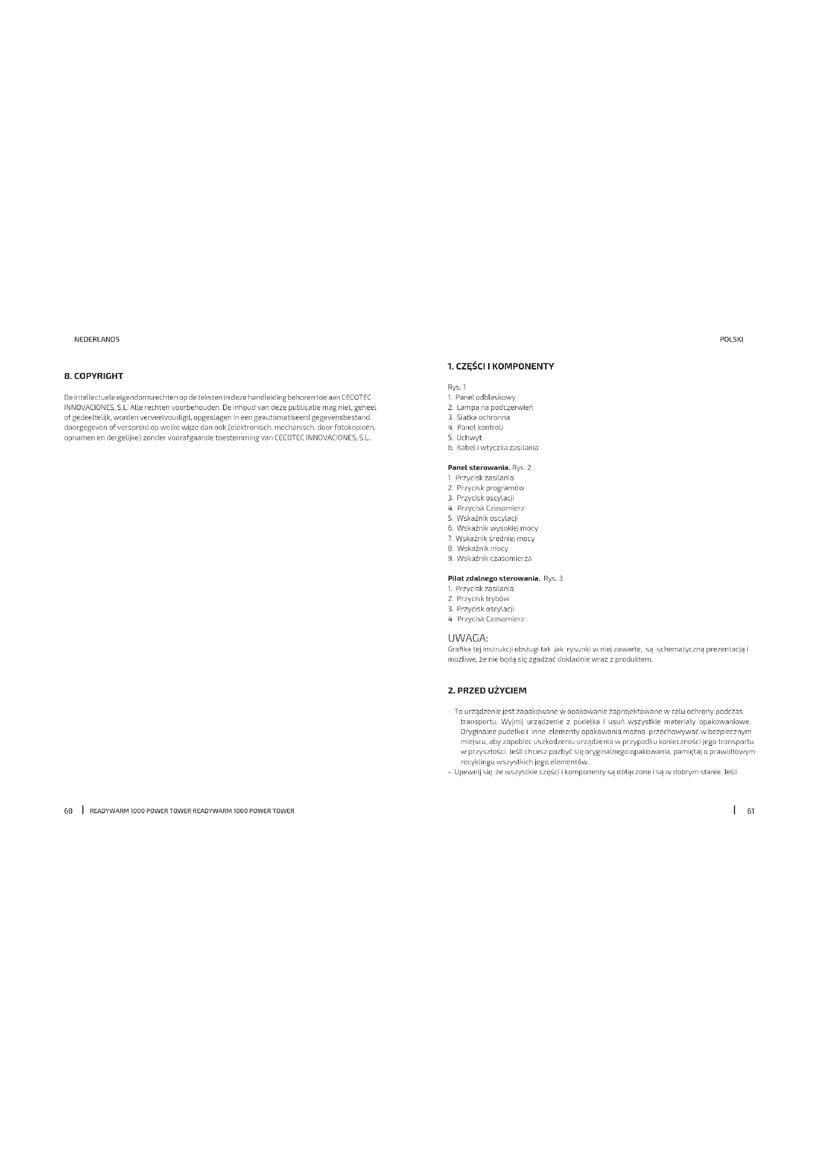 Konserwacja - Odłącz urządzenie przed przystąpieniem do konserwacji i pozwól mu całkowicie ostygnąć. - Aby utrzymać urządzenie w czystości, obudowę zewnętrzną można czyścić miękką, wilgotną ściereczką. - W razie potrzeby można użyć łagodnego detergentu. Po czyszczeniu upewnij się, że urządzenie jest suche. - Nie używaj produktów ściernych, może to spowodować uszkodzenie lub zniszczenie urządzenia. któregoś z nich brakuje lub jest w złym stanie, natychmiast skontaktuj się z ocjalnym Serwisem Pomocy Technicznej Cecotec. Zawartość opakowania - Ogrzewanie zewnętrzne - Pilot zdalnego sterowania - Ta instrukcja obsługi