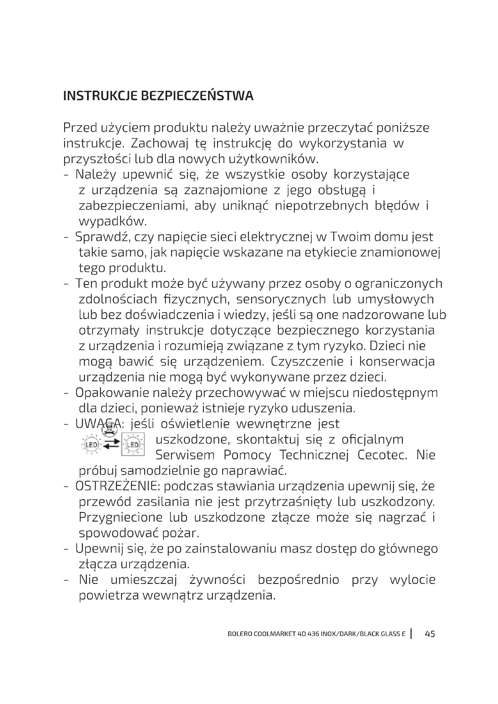 Przed użyciem produktu należy uważnie przeczytać poniższe instrukcje. Zachowaj tę instrukcję do wykorzystania w przyszłości lub dla nowych użytkowników. - Należy upewnić się, że wszystkie osoby korzystające z urządzenia są zaznajomione z jego obsługą i zabezpieczeniami, aby uniknąć niepotrzebnych błędów i wypadków. - Sprawdź, czy napięcie sieci elektrycznej w Twoim domu jest takie samo, jak napięcie wskazane na etykiecie znamionowej tego produktu. - Ten produkt może być używany przez osoby o ograniczonych zdolnościach zycznych, sensorycznych lub umysłowych lub bez doświadczenia i wiedzy, jeśli są one nadzorowane lub otrzymały instrukcje dotyczące bezpiecznego korzystania z urządzenia i rozumieją związane z tym ryzyko. Dzieci nie mogą bawić się urządzeniem. Czyszczenie i konserwacja urządzenia nie mogą być wykonywane przez dzieci. - Opakowanie należy przechowywać w miejscu niedostępnym dla dzieci, ponieważ istnieje ryzyko uduszenia. - UWAGA: jeśli oświetlenie wewnętrzne jest uszkodzone, skontaktuj się z ocjalnym Serwisem Pomocy Technicznej Cecotec. Nie próbuj samodzielnie go naprawiać. - OSTRZEŻENIE: podczas stawiania urządzenia upewnij się, że przewód zasilania nie jest przytrzaśnięty lub uszkodzony. Przygniecione lub uszkodzone złącze może się nagrzać i spowodować pożar. - Upewnij się, że po zainstalowaniu masz dostęp do głównego złącza urządzenia. - Nie umieszczaj żywności bezpośrednio przy wylocie powietrza wewnątrz urządzenia.46 BOLERO COOLMARKET 4D 436 INOX/DARK/BLACK GLASS E - Otwory wentylacyjne produktu powinny być wolne od przeszkód. - Nie należy umieszczać napojów gazowanych lub musujących w komorze zamrażarki, ponieważ powoduje to wzrost ciśnienia w pojemniku, co może doprowadzić do eksplozji i uszkodzenia urządzenia. - UWAGA: nie należy używać urządzeń mechanicznych lub innych środków do przyspieszenia procesu rozmrażania, które nie są zalecane przez Cecotec. - UWAGA: nie wolno uszkodzić układu chłodzenia. - Jeśli przewód jest uszkodzony, musi zostać wymieniony przez producenta, dystrybutora lub osobę o podobnych kwalikacjach, aby uniknąć zagrożenia. - UWAGA: nie używaj urządzeń elektrycznych wewnątrz lodówki. - Zaleca się regularne sprawdzanie przewodu zasilającego pod kątem jakichkolwiek oznak uszkodzenia; nie używaj urządzenia, jeśli przewód jest uszkodzony. - Aby uniknąć obrażeń lub śmierci w wyniku porażenia prądem, nie należy obsługiwać urządzenia mokrymi rękami lub na mokrej powierzchni. - Nie wolno używać tej lodówki z przedłużaczem lub listwą zasilającą. Upewnij się, że urządzenie jest podłączone bezpośrednio do gniazdka. - Podczas ustawiania urządzenia upewnij się, że z tyłu jest wolna przestrzeń, ponieważ znajduje się tam główny wylot ciepła. Umożliwi to odpowiednią wentylację. - Nie wkładaj gorących potraw ani napojów do urządzenia, pozwól im najpierw ostygnąć do temperatury pokojowej. - Nie umieszczaj żadnych innych urządzeń na lodówce i nie mocz jej. - W urządzeniu nie należy przechowywać substancji47 BOLERO COOLMARKET 4D 436 INOX/DARK/BLACK GLASS E wybuchowych, takich jak pojemniki aerozolowe lub łatwopalne materiały pędne. - To urządzenie przeznaczone jest wyłącznie do użytku domowego i nie nadaje się do użytku w barach, restauracjach, gospodarstwach rolnych, hotelach, motelach i biurach. - OSTRZEŻENIE: Aby uniknąć ryzyka związanego z niestabilnością lodówki, należy ją zainstalować zgodnie z instrukcją. - To urządzenie ma wbudowaną wtyczkę uziemiającą. Upewnij się, że domowe gniazdko elektryczne jest dobrze uziemione. - Odczekaj 5 minut po awarii zasilania przed ponownym podłączeniem urządzenia. W przeciwnym razie sprężarka może ulec uszkodzeniu. - To urządzenie nie jest przeznaczone do obsługi za pomocą zewnętrznych minutników lub systemów zdalnego sterowania. - Zawsze należy obchodzić się z urządzeniem ostrożnie, aby uniknąć uszkodzeń. - Mrożona żywność może powodować odmrożenia, jeśli zostanie spożyta natychmiast po wyjęciu z komory zamrażarki. - Nie wyjmuj ani nie dotykaj przedmiotów w komorze zamrażarki mokrymi/wilgotnymi rękami, ponieważ może to spowodować otarcia skóry lub odmrożenia. - Nigdy nie używaj podstawy, szuad ani drzwi do podparcia. - Nie przeciążaj półek w drzwiach ani nie umieszczaj zbyt dużej ilości żywności w szuadach, aby zapobiec spadnięciu przedmiotów i uszkodzeniu urządzenia. - OSTRZEŻENIE: Nie umieszczaj listew zasilających z wieloma wtyczkami lub wieloma zasilaczami z tyłu urządzenia. - Aby uniknąć skażenia żywności, należy przestrzegać poniższych instrukcji:48 BOLERO COOLMARKET 4D 436 INOX/DARK/BLACK GLASS E A. Długotrwałe otwieranie drzwi może spowodować znaczny wzrost temperatury w komorach urządzenia. B. Regularnie czyść powierzchnie, które mogą mieć kontakt z żywnością i dostępne systemy odpływowe. C. Wyczyść zbiornik na wodę, jeśli nie był używany przez 48 godzin. D. Przechowuj surowe mięso i ryby w odpowiednich pojemnikach w lodówce, aby nie miały kontaktu z innymi produktami spożywczymi ani nie kapały na nie. E. Dwugwiazdkowe komory na mrożonki nadają się do przechowywania wstępnie zamrożonej żywności, przechowywania lub robienia lodów i robienia kostek lodu. F. Komory z jedną, dwiema lub trzema gwiazdkami nie nadają się do zamrażania świeżej żywności. - Przed przystąpieniem do konserwacji i czyszczenia należy wyłączyć urządzenie i wyjąć wtyczkę z gniazdka elektrycznego. - Zaleca się odczekanie co najmniej czterech godzin przed podłączeniem urządzenia, aby olej mógł spłynąć do sprężarki. - Wokół urządzenia musi być dobra wentylacja; nieodpowiednie krążenie powietrza prowadzi do przegrzania. Aby uzyskać dobrą wentylację, postępuj zgodnie z instrukcjami instalacji. - Jeśli to możliwe, ty