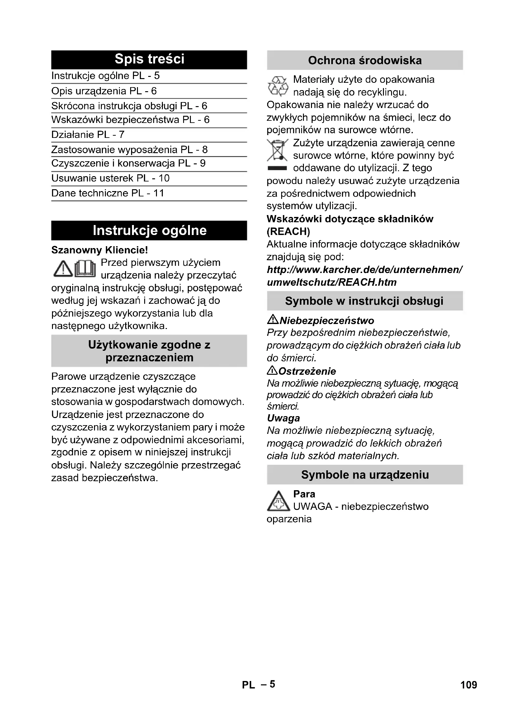 Razred zaščite I Stopnja zaščite IPX4 Podatki o zmogljivosti Ogrevalna moč 1600 W Mere Rezervoar za vodo 0,25 l Teža (brez pribora) 1,2 kg Širina 190 mm Dolžina 100 mm Višina 280 mm Poseben pribor Naročniška številka Set okroglih krtač 2.863-058 4 okrogle krtače za šobo s točkastim razprševanjem Komplet okroglih krtač z medeninastimi dlačicami 2.863-061 za odstranjevanje trdovratne umazanije. Idealen na neobčutljivih površinah. Okrogla krtača s strgalom 2.863-140 Okrogla krtača z dvemi vrstami dlačic, odpornih proti vročini, in strgalom. Ni primerna na občutljivih površinah. Palčke za odstranjevanje vodnega kamna 6.295-047 108 SL– 5 Szanowny Kliencie! Przed pierwszym użyciem urządzenia należy przeczytać oryginalną instrukcję obsługi, postępować według jej wskazań i zachować ją do późniejszego wykorzystania lub dla następnego użytkownika. Parowe urządzenie czyszczące przeznaczone jest wyłącznie do stosowania w gospodarstwach domowych. Urządzenie jest przeznaczone do czyszczenia z wykorzystaniem pary i może być używane z odpowiednimi akcesoriami, zgodnie z opisem w niniejszej instrukcji obsługi. Należy szczególnie przestrzegać zasad bezpieczeństwa. Materiały użyte do opakowania nadają się do recyklingu. Opakowania nie należy wrzucać do zwykłych pojemników na śmieci, lecz do pojemników na surowce wtórne. Zużyte urządzenia zawierają cenne surowce wtórne, które powinny być oddawane do utylizacji. Z tego powodu należy usuwać zużyte urządzenia za pośrednictwem odpowiednich systemów utylizacji. Wskazówki dotyczące składników (REACH) Aktualne informacje dotyczące składników znajdują się pod: http://www.karcher.de/de/unternehmen/ umweltschutz/REACH.htm Niebezpieczeństwo Przy bezpośrednim niebezpieczeństwie, prowadzącym do ciężkich obrażeń ciała lub do śmierci. 몇 Ostrzeżenie Na możliwie niebezpieczną sytuację, mogącą prowadzić do ciężkich obrażeń ciała lub śmierci. Uwaga Na możliwie niebezpieczną sytuację, mogącą prowadzić do lekkich obrażeń ciała lub szkód materialnych. Para UWAGA - niebezpieczeństwo oparzenia Spis treści Instrukcje ogólne PL - 5 Opis urządzenia PL - 6 Skrócona instrukcja obsługi PL - 6 Wskazówki bezpieczeństwa PL - 6 Działanie PL - 7 Zastosowanie wyposażenia PL - 8 Czyszczenie i konserwacja PL - 9 Usuwanie usterek PL - 10 Dane techniczne PL - 11 Instrukcje ogólne Użytkowanie zgodne z przeznaczeniem Ochrona środowiska Symbole w instrukcji obsługi Symbole na urządzeniu 109PL– 6 Zakres dostawy urządzenia przedstawiony jest opakowaniu. Podczas rozpakowywania urządzenia należy sprawdzić, czy w opakowaniu znajdują się wszystkie elementy. W przypadku stwierdzenia braków w akcesoriach lub uszkodzeń przy transporcie należy zwrócić się do dystrybutora. Î Ilustracje, patrz strona rozkładana 3 Î Ilustracje, patrz strona rozkładana 4 1Zdjąć zbiornik na wodę. 2Zdjąć pokrywę zbiornika. 3 Napełnić zbiornik, włożyć korek. 4 Zamocować zbiornik na wodę. 5Podłączyć urządzenie do zasilania. Po upływie ok. 15 sekund urządzenie jest gotowe do pracy. 6Przesunąć suwak blokady do tyłu, nacisnąć dźwignię parowania. Niebezpieczeństwo Eksploatacja urządzenia w miejscach zagrożonych wybuchem jest zabroniona. Podczas użytkowania urządzenia w obszarach zagrożonych należy przestrzegać stosownych przepisów bezpieczeństwa. Nie używać urządzenia w basenach pływackich, zawierających wodę. Nie można używać urządzenia do czyszczenia urządzeń elektrycznych np. piekarników, okapów kuchennych, kuchenek mikrofalowych, telewizorów, lamp, suszarek, grzejników elektrycznych itd. Przed użyciem urządzenia i akcesoriów należy sprawdzić ich stan. Jeżeli stan techniczny budzi zastrzeżenia, to sprzętu takiego nie wolno używać. Szczególnie należy sprawdzić przewód sieciowy, zamknięcie bezpieczeństwa i przewód parowy. W przypadku uszkodzenia przewodu zasilającego niezwł ocznie zlecić jego wymianę przez autoryzowany serwis lub wykwalifikowanego elektryka. Uszkodzony przewód parowy należy niezwłocznie wymienić. Wolno stosować tylko zalecane przez producenta przewody parowe (numer katalogowy patrz Specyfikacja części zamiennych). Nigdy nie dotykać wtyczki ani gniazdka mokrymi rękami. Nie czyścić parą przedmiotów zawierających materiały szkodliwe dla zdrowia (np. azbest). Nigdy nie dotykać ręką strumienia pary z małej odległości, ani nie kierować go na ludzi, ani na zwierzęta (grozi poparzeniem). 몇 Ostrzeżenie Urządzenie można podłączyć jedynie do przyłącza elektrycznego wykonanego przez elektryka zgodnie z normą IEC