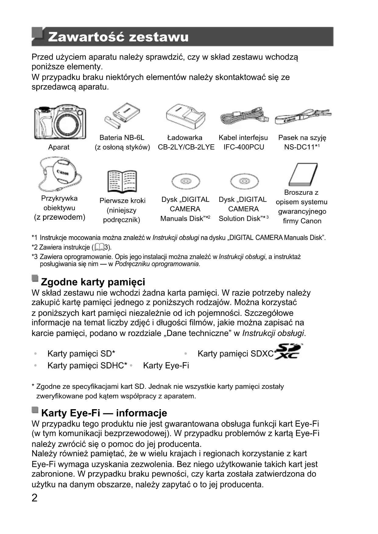 Zawartość zestawu Przed użyciem aparatu należy sprawdzić, czy w skład zestawu wchodzą poniższe elementy. W przypadku braku niektórych elementów należy skontaktować się ze sprzedawcą aparatu. AparatBateria NB-6L(z osłoną styków)ŁadowarkaCB-2LY/CB-2LYEKabel interfejsuIFC-400PCUPasek na szyjęNS-DC11* Przykrywka obiektywu (z przewodem) Pierwsze kroki (niniejszy podręcznik)Dysk „DIGITAL CAMERA Manuals Disk”* Dysk „DIGITAL CAMERA Solution Disk”* Broszura z opisem systemu gwarancyjnego rmy Canon *1 Instrukcje mocowania można znaleźć w Instrukcji obsługi na dysku „DIGITAL CAMERA Manuals Disk”. *2 Zawiera instrukcje (