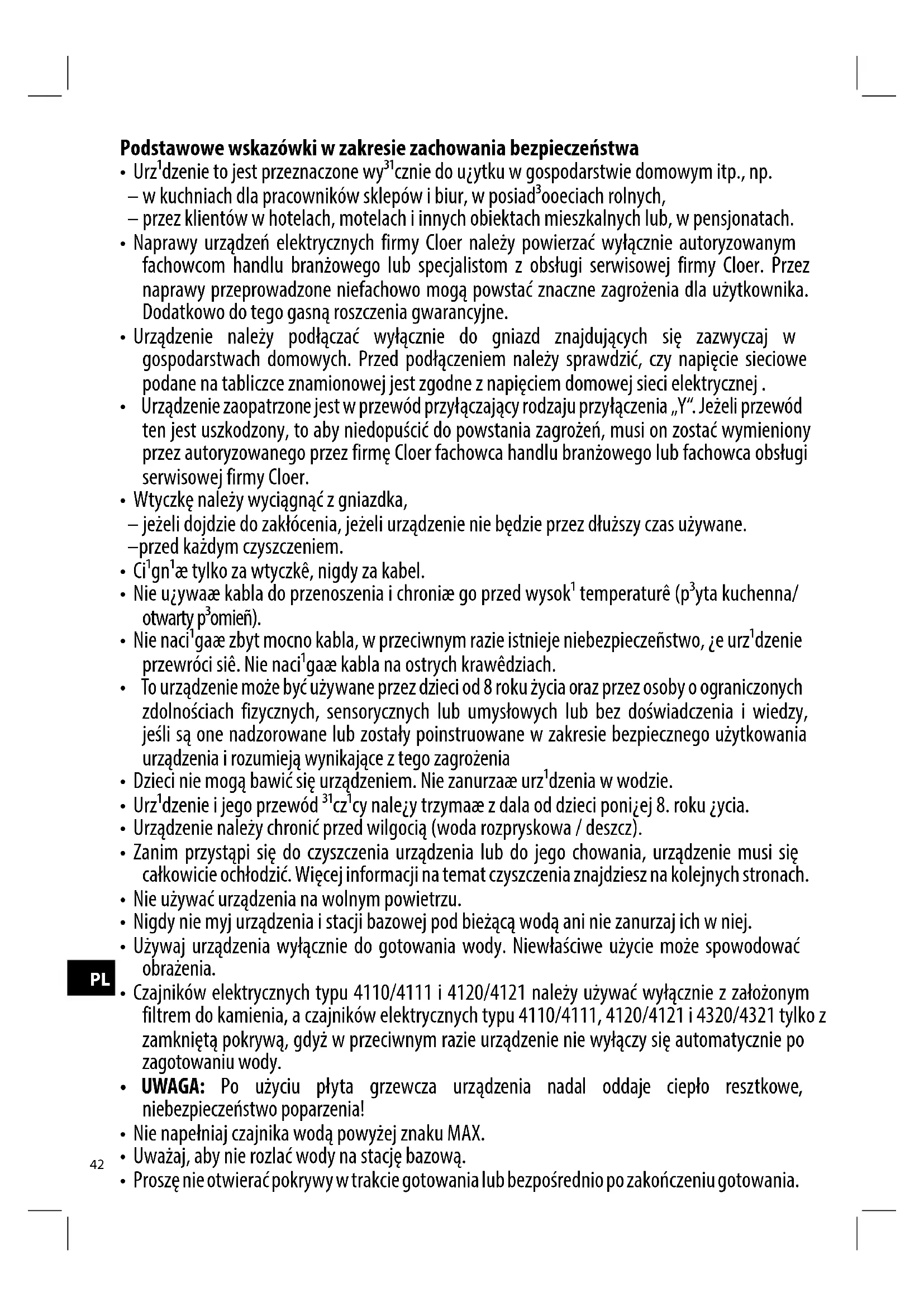 - Naprawy urządzeń elektrycznych firmy Cloer należy powierzać wyłącznie autoryzowanym fachowcom handlu branżowego lub specjalistom z obsługi serwisowej firmy Cloer. Przez naprawy przeprowadzone niefachowo mogą powstać znaczne zagrożenia dla użytkownika. Dodatkowo do tego gasną roszczenia gwarancyjne.