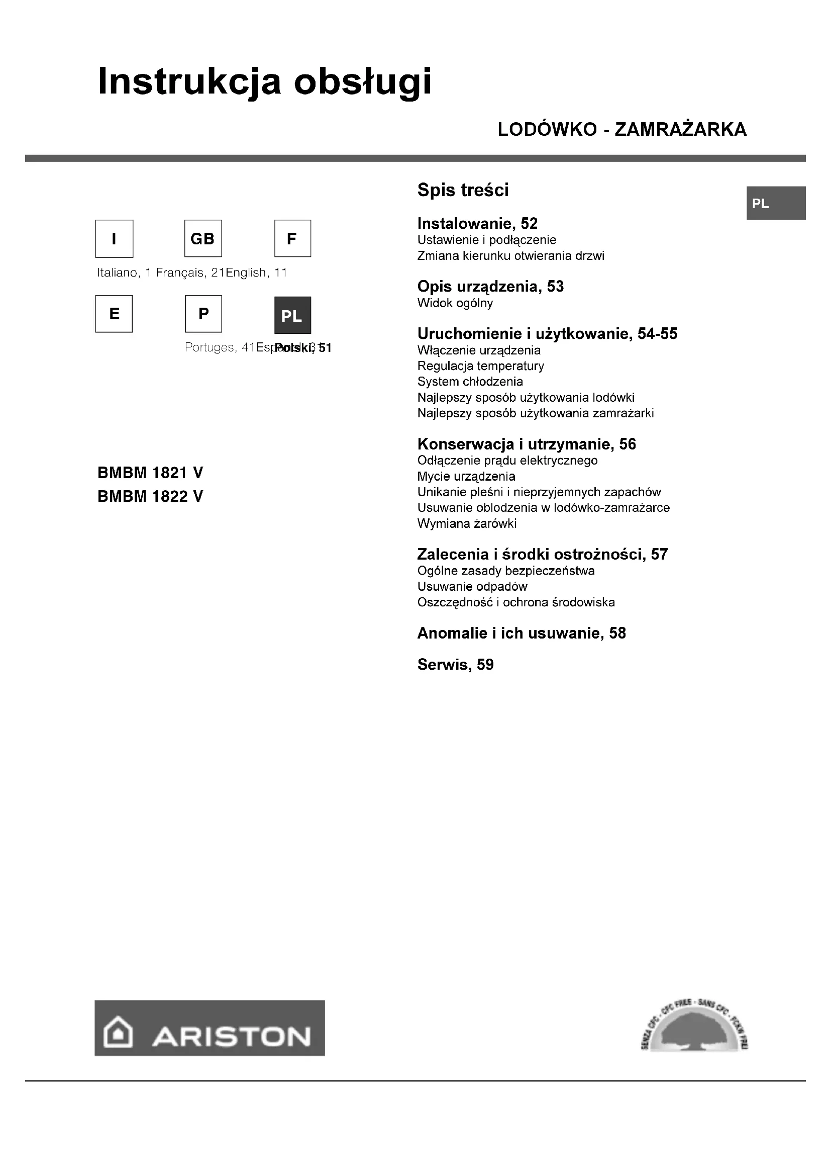 Instrukcja obs³ugi Spis treci Instalowanie, 52 Ustawienie i pod³¹czenie Zmiana kierunku otwierania drzwi Opis urz¹dzenia, 53 Widok ogólny Uruchomienie i u¿ytkowanie, 54-55 W³¹czenie urz¹dzenia Regulacja temperatury System ch³odzenia Najlepszy sposób u¿ytkowania lodówki Najlepszy sposób u¿ytkowania zamra¿arki Konserwacja i utrzymanie, 56 Od³¹czenie pr¹du elektrycznego Mycie urz¹dzenia Unikanie pleni i nieprzyjemnych zapachów Usuwanie oblodzenia w lodówko-zamra¿arce Wymiana ¿arówki Zalecenia i rodki ostro¿noci, 57 Ogólne zasady bezpieczeñstwa Usuwanie odpadów Oszczêdnoæ i ochrona rodowiska Anomalie i ich usuwanie, 58 Serwis, 59 BMBM 1821 V BMBM 1822 V Italiano, 1 Français, 21English, 11
