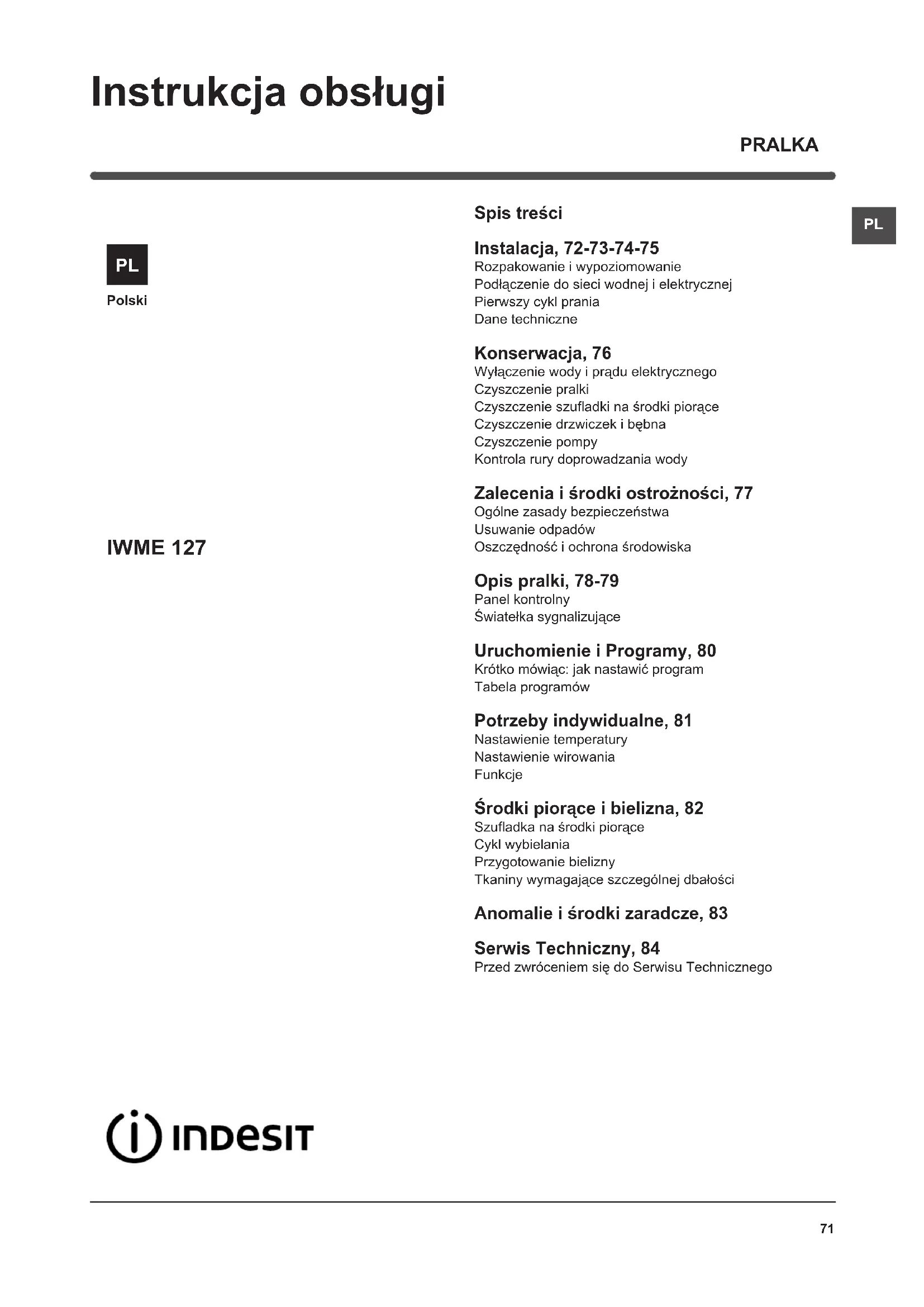 IWME 127 - Pralka INDESIT - Bezpłatna instrukcja obsługi