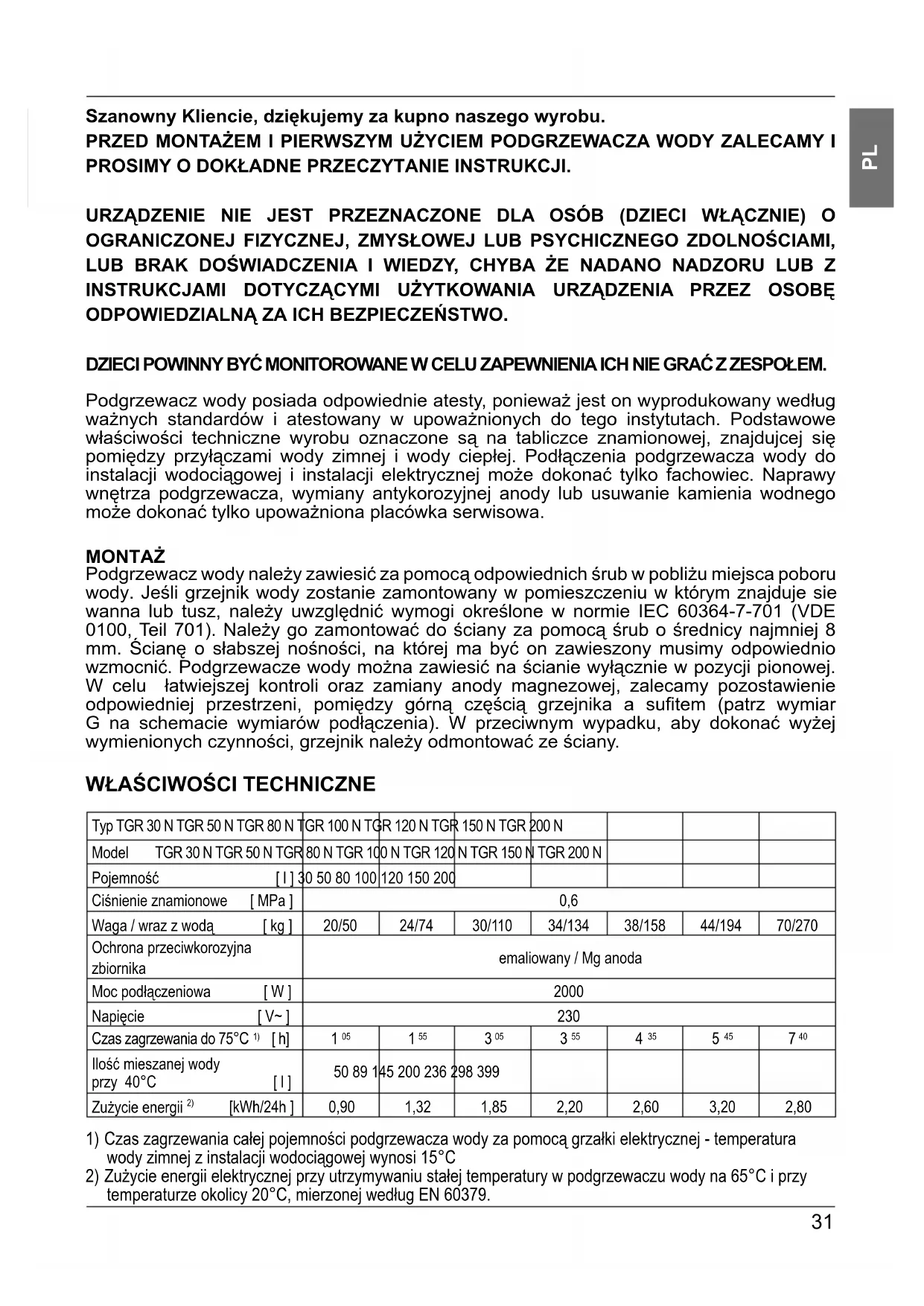 Szanowny Kliencie, dziękujemy za kupno naszego wyrobu. PRZED MONTAŻEM I PIERWSZYM UŻYCIEM PODGRZEWACZA WODY ZALECAMY I PROSIMY O DOKŁADNE PRZECZYTANIE INSTRUKCJI. URZĄDZENIE NIE JEST PRZEZNACZONE DLA OSÓB (DZIECI WŁĄCZNIE) O OGRANICZONEJ FIZYCZNEJ, ZMYSŁOWEJ LUB PSYCHICZNEGO ZDOLNOŚCIAMI, LUB BRAK DOŚWIADCZENIA I WIEDZY, CHYBA ŻE NADANO NADZORU LUB Z INSTRUKCJAMI DOTYCZĄCYMI UŻYTKOWANIA URZĄDZENIA PRZEZ OSOBĘ ODPOWIEDZIALNĄ ZA ICH BEZPIECZEŃSTWO. DZIECI POWINNY BYĆ MONITOROWANE W CELU ZAPEWNIENIA ICH NIE GRAĆ Z ZESPOŁEM. Podgrzewacz wody posiada odpowiednie atesty, ponieważ jest on wyprodukowany według ważnych standardów i atestowany w upoważnionych do tego instytutach. Podstawowe właściwości techniczne wyrobu oznaczone są na tabliczce znamionowej, znajdujcej się pomiędzy przyłączami wody zimnej i wody ciepłej. Podłączenia podgrzewacza wody do instalacji wodociągowej i instalacji elektrycznej może dokonać tylko fachowiec. Naprawy wnętrza podgrzewacza, wymiany antykorozyjnej anody lub usuwanie kamienia wodnego może dokonać tylko upoważniona placówka serwisowa. MONTAŻ Podgrzewacz wody należy zawiesić za pomoc ą odpowiednich śrub w pobliżu miejsca poboru wody. Jeśli grzejnik wody zostanie zamontowany w pomieszczeniu w którym znajduje sie wanna lub tusz, należy uwzględnić wymogi określone w normie IEC 60364-7-701 (VDE 0100, Teil 701). Należy go zamontować do ściany za pomocą śrub o średnicy najmniej 8 mm. Ścianę o słabszej nośności, na której ma być on zawieszony musimy odpowiednio wzmocnić. Podgrzewacze wody można zawiesić na ścianie wyłącznie w pozycji pionowej. W celu łatwiejszej kontroli oraz zamiany anody magnezowej, zalecamy pozostawienie odpowiedniej przestrzeni, pomiędzy górną częścią grzejnika a sufi tem (patrz wymiar G na schemacie wymiarów podłączenia). W przeciwnym wypadku, aby dokonać wyżej wymienionych czynności, grzejnik należy odmontować ze ściany.