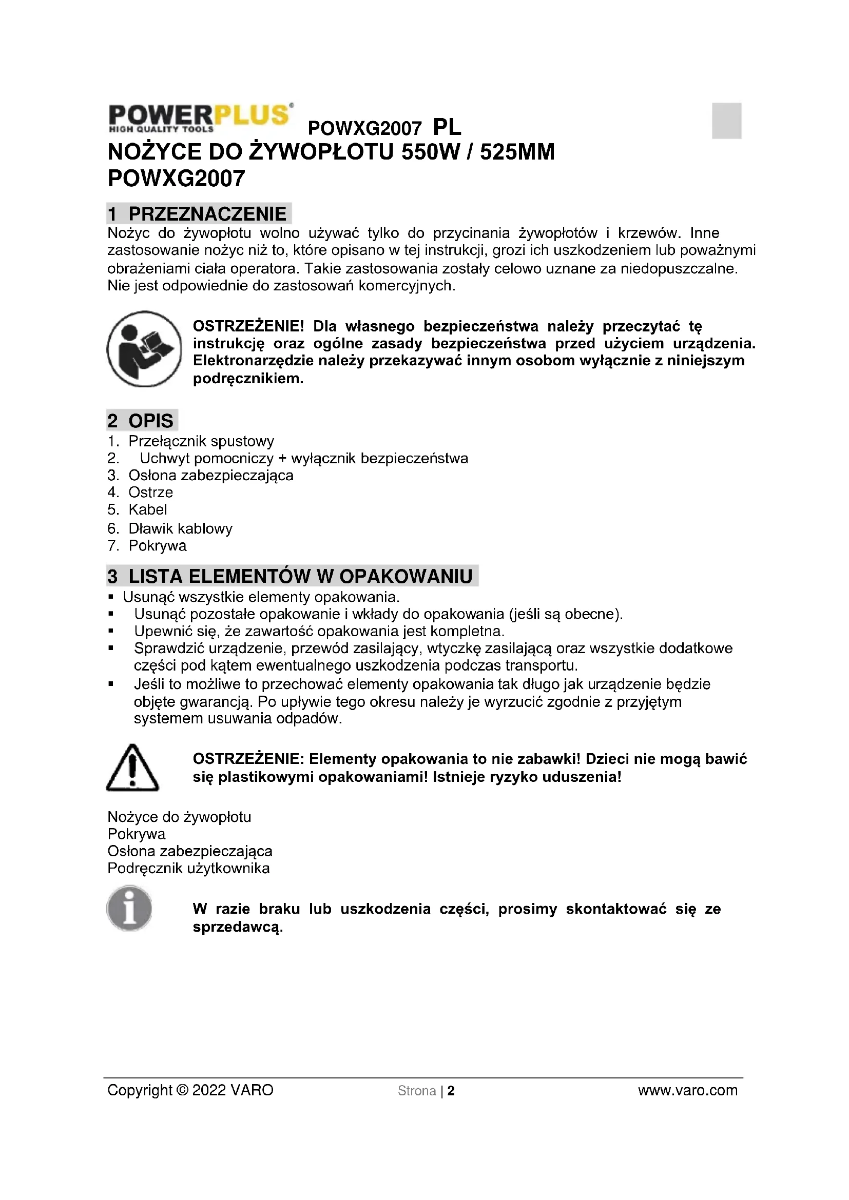 Copyright © 2022 VARO Strona | 2 www.varo.com NOŻYCE DO ŻYWOPŁOTU 550W / 525MM POWXG2007 1 PRZEZNACZENIE Nożyc do żywopłotu wolno używać tylko do przycinania żywopłotów i krzewów. Inne zastosowanie nożyc niż to, które opisano w tej instrukcji, grozi ich uszkodzeniem lub poważnymi obrażeniami ciała operatora. Takie zastosowania zostały celowo uznane za niedopuszczalne. Nie jest odpowiednie do zastosowań komercyjnych. OSTRZEŻENIE! Dla własnego bezpieczeństwa należy przeczytać tę instrukcję oraz ogólne zasady bezpieczeństwa przed użyciem urządzenia. Elektronarzędzie należy przekazywać innym osobom wyłącznie z niniejszym podręcznikiem. 2 OPIS