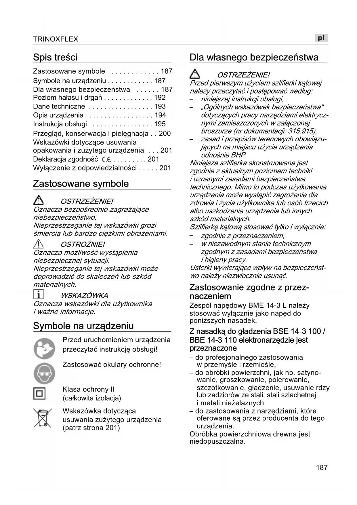 Zastosowanie zgodne z przez- naczeniem Zespół napędowy BME 14-3 L należy stosować wyłącznie jako napęd do poniższych nasadek. Z nasadką do gładzenia BSE 14-3 100 / BBE 14-3 110 elektronarzędzie jest przeznaczone – do profesjonalnego zastosowania w przemyśle i rzemiośle,– do obróbki powierzchni, jak np. satyno-wanie, groszkowanie, polerowanie, szczotkowanie, gładzenie, usuwanie rdzy lub zadziorów ze stali, stali szlachetnej i metali nieżelaznych– do zastosowania z narzędziami, które oferowane są przez producenta do tego urządzenia.Obróbka powierzchniowa drewna jest niedopuszczalna.TRINOXFLEX