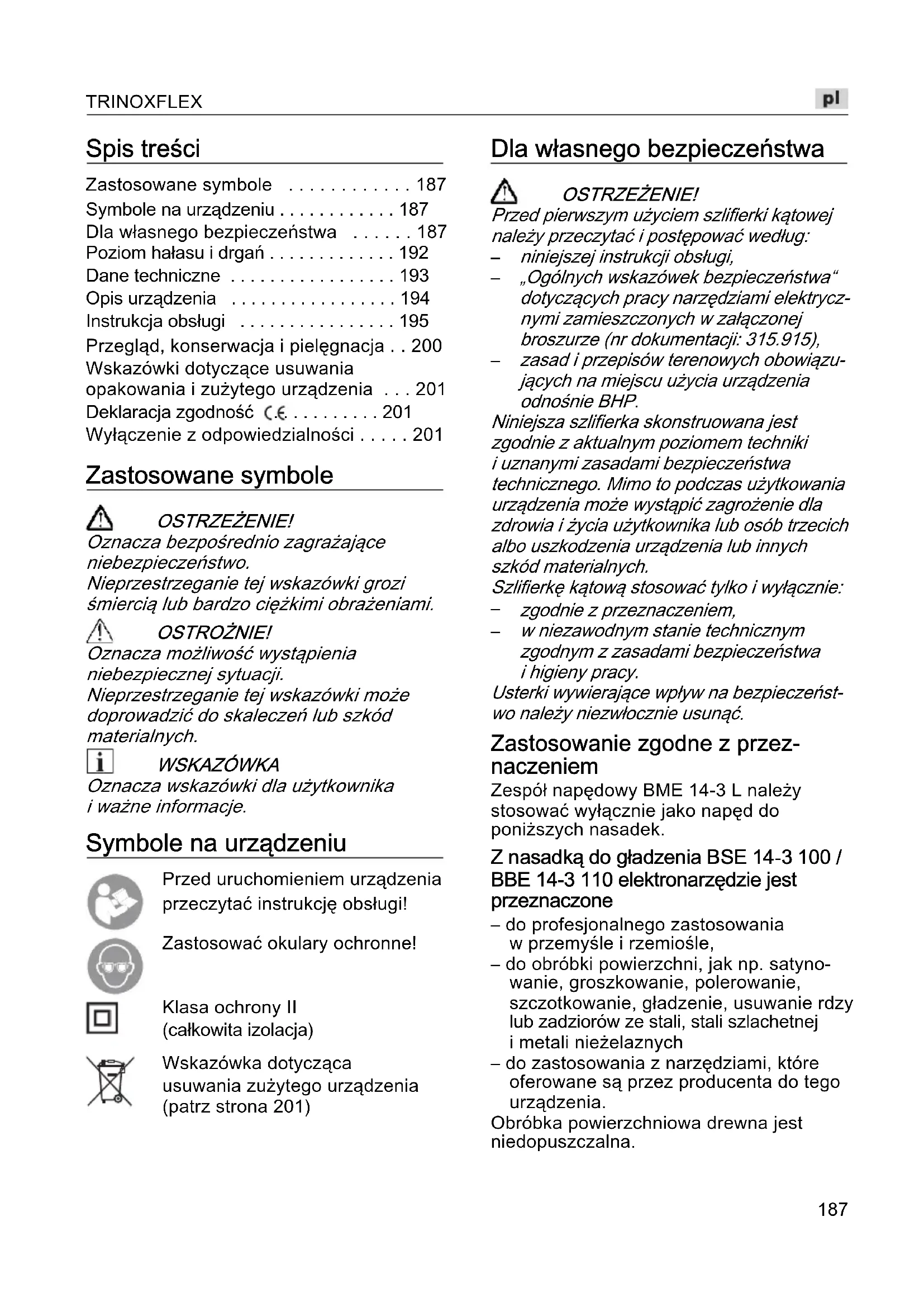 - Wyłączenie z odpowiedzialności Zastosowane symbole OSTRZEŻENIE! Oznacza bezpośrednio zagrażające niebezpieczeństwo. Nieprzestrzeganie tej wskazówki grozi śmiercią lub bardzo ciężkimi obrażeniami. OSTROŻNIE! Oznacza możliwość wystąpienia niebezpiecznej sytuacji. Nieprzestrzeganie tej wskazówki może doprowadzić do skaleczeń lub szkód materialnych. WSKAZÓWKA Oznacza wskazówki dla użytkownika i ważne informacje. Symbole na urządzeniu Przed uruchomieniem urządzenia przeczytać instrukcję obsługi!Zastosować okulary ochronne!Klasa ochrony II (całkowita izolacja)Wskazówka dotycząca usuwania zużytego urządzenia (patrz strona 201) Dla własnego bezpieczeństwa OSTRZEŻENIE! Przed pierwszym użyciem szlifierki kątowej należy przeczytać i postępować według: p. 201