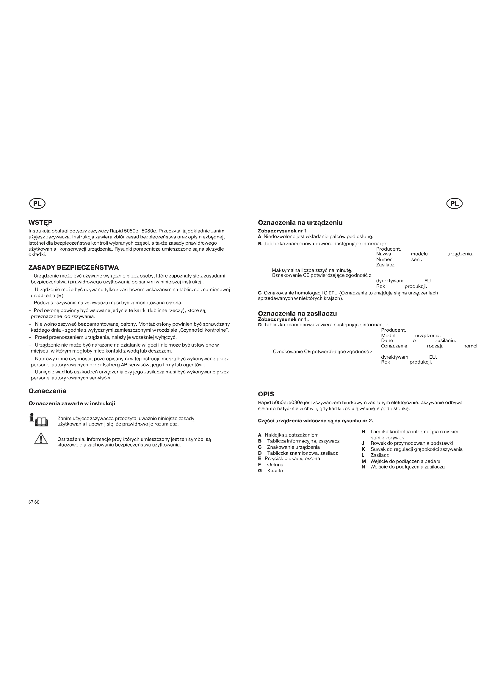 Oznaczenia na urządzeniu Zobacz rysunek nr 1 A Niedozwolone jest wkładanie palców pod osłonę. B Tabliczka znamionowa zawiera następujące informacje: Producent. Nazwa modelu urządzenia. Numer serii. Zasilacz. Maksymalna liczba zszyć na minutę. Oznakowanie CE potwierdzające zgodność z dyrektywami EU Rok produkcji. C Oznakowanie homologacji C ETL (Oznaczenie to znajduje się na urządzeniach sprzedawanych w niektórych krajach). Oznaczenia na zasilaczu Zobacz rysunek nr 1. D Tabliczka znamionowa zawiera następujące informacje: Producent. Model urządzenia. Dane o zasilaniu. Oznaczenie rodzaju homologacji. Oznakowanie CE potwierdzające zgodność z dyrektywami EU. Rok produkcji. OPIS Rapid 5050e/5080e jest zszywaczem biurkowym zasilanym elektrycznie. Zszywanie odbywa się automatycznie w chwili, gdy kartki zostają wsunięte pod osłonkę. Części urządzenia widoczne są na rysunku nr 2. A Naklejka z ostrzeżeniem B Tablicza informacyjna, zszywacz C Znakowanie urządzenia D Tabliczka znamionowa, zasilacz E Przycisk blokady, osłona F Osłona G Kaseta H Lampka kontrolna informująca o niskim stanie zszywek J Rowek do przymocowania podstawki K Suwak do regulacji głębokości zszywania L Zasilacz M Wejście do podłączenia pedału N Wejście do podłączenia zasilacza