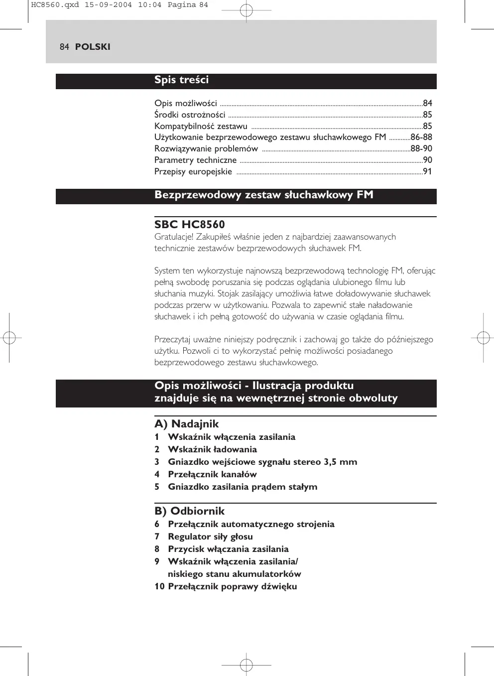 Philips Consumer Electronics, B.U. Peripherals & Accessories deklarujeniniejszym zgodnosc swojeno bezprzewodowej zestawu sluchawkowej FM typu SBC HC8560 z zasadniczymi wymaganiami i innymi, odpowiednimi postanowieniami Dyrektywy e 1999/5/EC.