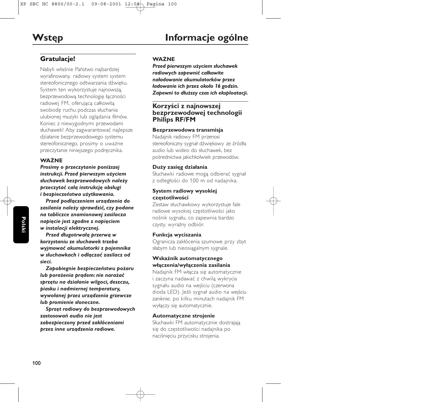 09-08-2001 12:08 Wstęp Gratulacje! Nabyli właśnie Państwo najbardziej wyrafinowany, radiowy system system stereofonicznego odtwarzania dźwięku. System ten wykorzystuje najnowszą, bezprzewodową technologię łączności radiowej FM, oferującą całkowitą swobodę ruchu podczas słuchania ulubionej muzyki lub oglądania filmów. Koniec z niewygodnymi przewodami słuchawek! Aby zagwarantować najlepsze działanie bezprzewodowego systemu stereofonicznego, prosimy o uważne przeczytanie niniejszego podręcznika. Polski WAŻNE Prosimy o przeczytanie poniższej instrukcji. Przed pierwszym użyciem słuchawek bezprzewodowych należy przeczytać całą instrukcję obsługi i bezpieczeństwa użytkowania. Przed podłączeniem urządzenia do zasilania należy sprawdzić, czy podane na tabliczce znamionowej zasilacza napięcie jest zgodne z napięciem w instalacji elektrycznej. Przed długotrwałą przerwą w korzystaniu ze słuchawek trzeba wyjmować akumulatorki z pojemnika w słuchawkach i odłączać zasilacz od sieci. Zapobiegnie bezpieczeństwu pożaru lub porażenia prądem: nie narażać sprzętu na działanie wilgoci, deszczu, piasku i nadmiernej temperatury, wywołanej przez urządzenia grzewcze lub promienie słoneczne. Sprzęt radiowy do bezprzewodowych zastosowań audio nie jest zabezpieczony przed zakłóceniami przez inne urządzenia radiowe.
