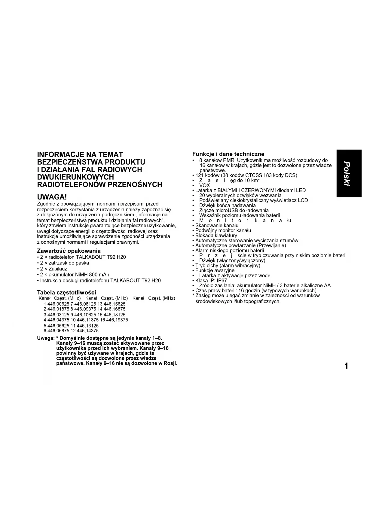 - Instrukcja obsługi radiotelefonu TALKABOUT T92 H20 Tabela częstotliwości Uwaga: * Domyślnie dostępne są jedynie kanały 1–8. Kanały 9–16 muszą zostać aktywowane przez użytkownika przed ich wybraniem. Kanały 9–16 powinny być używane w krajach, gdzie te częstotliwości są dozwolone przez władze państwowe. Kanały 9–16 nie są dozwolone w Rosji. Funkcje i dane techniczne