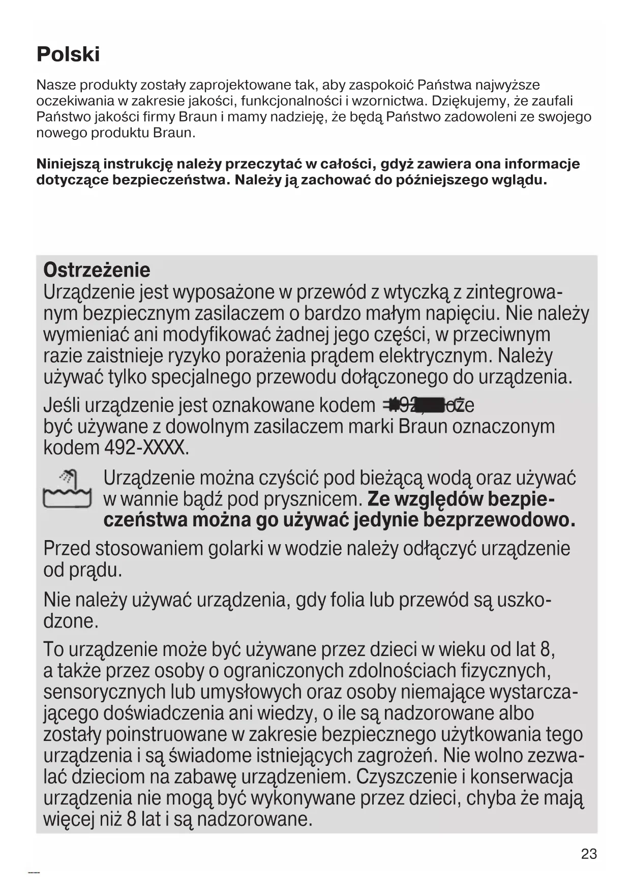nettoyage. Appuyez de nouveau sur le bouton marche. Augmentation de la consomma- tion de liquide de nettoyage. L’orifice de la station Clean&Charge est bou- ché. – Nettoyez l’orifice avec un cure-dents en bois. – Nettoyez régulièrement le bac de net- toyage. Garantie Nous accordons une garantie de 2 ans sur ce produit, à partir de la date d’achat. Pendant la durée de la garantie, Braun prendra gratuitement à sa charge la réparation des vices de fabrication ou de matière en se réservant le droit de décider si certaines pièces doivent être réparées ou si l’appareil lui-même doit être échangé. Cette garantie s’étend à tous les pays où cet appareil est commercialisé par Braun ou son distributeur exclusif. Cette garantie ne couvre pas : les dommages occasionnés par une utilisation inadéquate, l’usure normale (par exemple, grille et bloc-couteaux) ainsi que les défauts d’usures qui ont un effet négligeable sur la valeur ou l’utilisation de l’appareil. Cette garantie devient caduque si des réparations ont été effectuées par des personnes non agréées par Braun et si des pièces de rechange ne provenant pas de Braun ont été utilisées. 91092674_Series_5-2cc_wd_CEEMEA_S6-132.indd 2191092674_Series_5-2cc_wd_CEEMEA_S6-132.indd 21 23.11.16 15:4123.11.16 15:41 CSS APPROVED Effective Date 30Nov2016 GMT - Printed 05Apr2017 Page 21 of 13222 Pour toute réclamation intervenant pendant la période de garantie, retournez ou rapportez l’appareil ainsi que l’attestation de garantie à votre revendeur ou à un Centre Service Agréé Braun. Veuillez vous référer à www.service.braun.com ou appeler le 0 800 944 802 (service consommateurs – service & appel gratuits) pour connaître le Centre Service Agréé Braun le plus proche de chez vous. Clause spéciale pour la France Outre la garantie contractuelle exposée ci-dessus, nos clients bénéficient de la garantie légale des vices caches prévue aux articles 1641 et suivants du Code civil. 91092674_Series_5-2cc_wd_CEEMEA_S6-132.indd 2291092674_Series_5-2cc_wd_CEEMEA_S6-132.indd 22 23.11.16 15:4123.11.16 15:41 CSS APPROVED Effective Date 30Nov2016 GMT - Printed 05Apr2017 Page 22 of 13223 Polski Nasze produkty zostały zaprojektowane tak, aby zaspokoić Państwa najwyższe oczekiwania w zakresie jakości, funkcjonalności i wzornictwa. Dziękujemy, że zaufali Państwo jakości firmy Braun i mamy nadzieję, że będą Państwo zadowoleni ze swojego nowego produktu Braun. Niniejszą instrukcję należy przeczytać w całości, gdyż zawiera ona informacje dotyczące bezpieczeństwa. Należy ją zachować do późniejszego wglądu. Ostrzeżenie Urządzenie jest wyposażone w przewód z wtyczką z zintegrowa- nym bezpiecznym zasilaczem o bardzo małym napięciu. Nie należy wymieniać ani modyfikować żadnej jego części, w przeciwnym razie zaistnieje ryzyko porażenia prądem elektrycznym. Należy używać tylko specjalnego przewodu dołączonego do urządzenia. Jeśli urządzenie jest oznakowane kodem 492, może być używane z dowolnym zasilaczem marki Braun oznaczonym kodem 492-XXXX. Urządzenie można czyścić pod bieżącą wodą oraz używać w wannie bądź pod prysznicem. Ze względów bezpie- czeństwa można go używać jedynie bezprzewodowo. Przed stosowaniem golarki w wodzie należy odłączyć urządzenie od prądu. Nie należy używać urządzenia, gdy folia lub przewód są uszko- dzone. To urządzenie może być używane przez dzieci w wieku od lat 8, a także przez osoby o ograniczonych zdolnościach fizycznych, sensorycznych lub umysłowych oraz osoby niemające wystarcza- jącego doświadczenia ani wiedzy, o ile są nadzorowane albo zostały poinstruowane w zakresie bezpiecznego użytkowania tego urządzenia i są świadome istniejących zagrożeń. Nie wolno zezwa- lać dzieciom na zabawę urządzeniem. Czyszczenie i konserwacja urządzenia nie mogą być wykonywane przez dzieci, chyba że mają więcej niż 8 lat i są nadzorowane. 91092674_Series_5-2cc_wd_CEEMEA_S6-132.indd 2391092674_Series_5-2cc_wd_CEEMEA_S6-132.indd 23 23.11.16 15:4123.11.16 15:41 CSS APPROVED Effective Date 30Nov2016 GMT - Printed 05Apr2017 Page 23 of 13224 Baza ładująco-czyszcząca Aby zapobiec wyciekaniu płynu czyszczącego, należy upewnić się, że baza ładująco-czyszcząca jest ustawiona na płaskiej powierzchni. Gdy zainstalowany jest wkład czyszczący, nie należy przechylać, nagle przesuwać ani przenosić bazy w żaden sposób, gdyż płyn czyszczący może wylać się z wkładu. Nie należy umiesz- czać bazy wewnątrz szafki łazienkowej ani też kłaść jej na powierzchni polerowanej bądź lakierowanej. Wkład czyszczący zawiera łatwopalny płyn, więc należy go prze- chowywać z dala od źródeł ognia. Nie wystawiać na bezpośrednie działanie promieni słonecznych ani na dym papierosowy. Nie prze- chowywać nad grzejnikiem. Nie należy ponownie napełniać wkładu, lecz używać jedynie oryginalnych wkładów wymiennych firmy Braun. Golarka 1 Kaseta na folię i nożyki 2 Przycisk wyjęcia kasety 3 Przełącznik MultiHeadLock 4 Włącznik 5 Wyświetlacz golarki 5a Symbol blokady (blokada podróżna) 5b Wskaźnik ładowania 5c Wskaźnik czyszczenia 5d Symbol akumulatora 6 Trymer do długiego zarostu 7 Styki łączące bazę z golarką 8 Przycisk zwalniający trymer do długiego zarostu 9 Gniazdko zasilania golarki 10 Specjalny przewód z wtyczką (jej konstrukcja może się różnić) 11 Nasadka ochronna* 12 Etui podróżne*