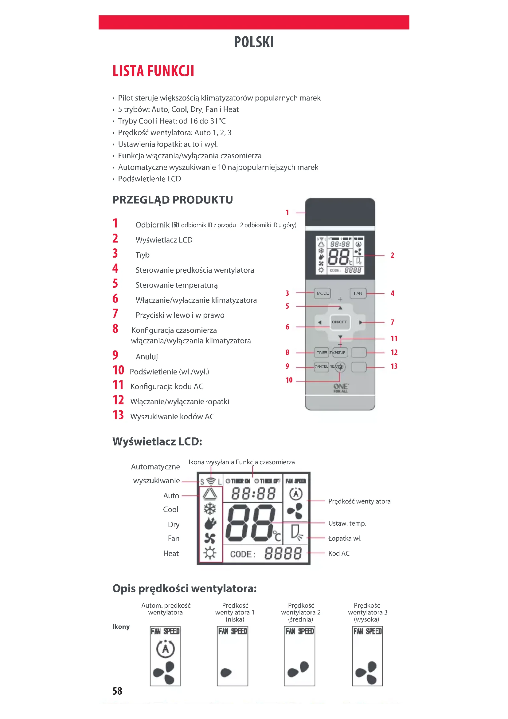 1 Odbiornik IR (1 odbiornik IR z przodu i 2 odbiorniki IR u góry) 2 Wyświetlacz LCD 3 Tryb 4 Sterowanie prędkością wentylatora 5 Sterowanie temperaturą 6 Włączanie/wyłączanie klimatyzatora 7 Przyciski w lewo i w prawo 8 Konguracja czasomierza włączania/wyłączania klimatyzatora 9 Anuluj 10 Podświetlenie (wł./wył.) 11 Konguracja kodu AC 12 Włączanie/wyłączanie łopatki 13 Wyszukiwanie kodów AC LISTA FUNKCJI MODE