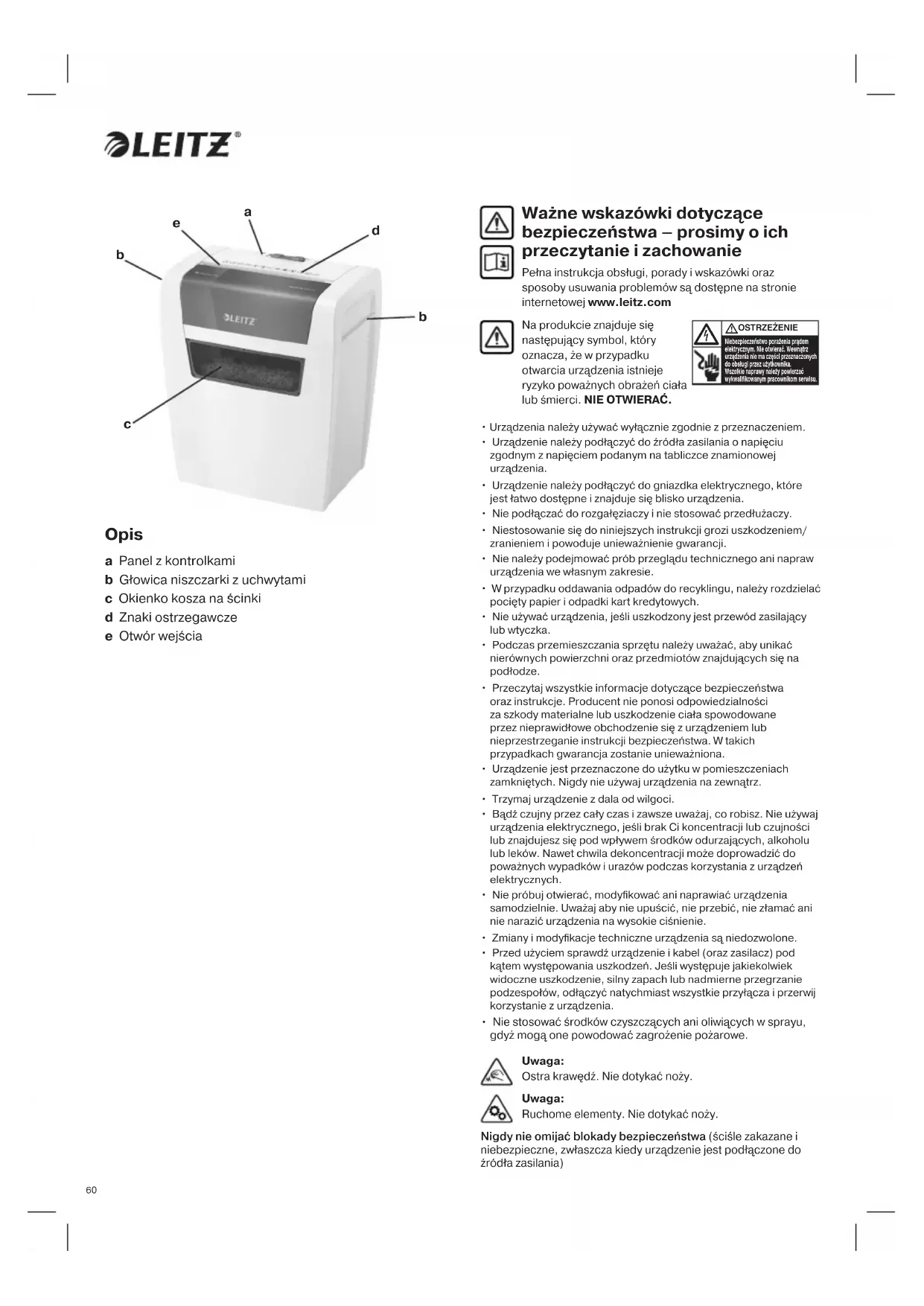 - Nie stosować środków czyszczących ani oliwiących w sprayu, gdyż mogą one powodować zagrożenie pożarowe. Ważne wskazówki dotyczące bezpieczeństwa – prosimy o ich przeczytanie i zachowanie Pełna instrukcja obsługi, porady i wskazówki oraz sposoby usuwania problemów są dostępne na stronie internetowej www.leitz.com Na produkcie znajduje się następujący symbol, który oznacza, że w przypadku otwarcia urządzenia istnieje ryzyko poważnych obrażeń ciała lub śmierci. NIE OTWIERAĆ. Niebezpieczeństwo porażenia prądem elektrycznym. Nie otwierać. Wewnątrz urządzenia nie ma części przeznaczonych do obsługi przez użytkownika. Wszelkie naprawy należy powierzać wykwalikowanym pracownikom serwisu. OSTRZEŻENIE