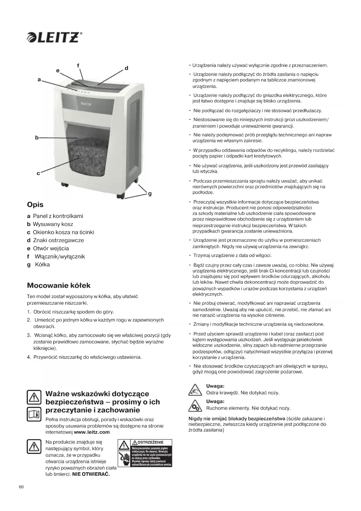 - Nie stosować środków czyszczących ani oliwiących w sprayu, gdyż mogą one powodować zagrożenie pożarowe. Ważne wskazówki dotyczące bezpieczeństwa – prosimy o ich przeczytanie i zachowanie Pełna instrukcja obsługi, porady i wskazówki oraz sposoby usuwania problemów są dostępne na stronie internetowej www.leitz.com Na produkcie znajduje się następujący symbol, który oznacza, że w przypadku otwarcia urządzenia istnieje ryzyko poważnych obrażeń ciała lub śmierci. NIE OTWIERAĆ. Niebezpieczeństwo porażenia prądem elektrycznym. Nie otwierać. Wewnątrz urządzenia nie ma części przeznaczonych do obsługi przez użytkownika. Wszelkie naprawy należy powierzać wykwalikowanym pracownikom serwisu. OSTRZEŻENIE