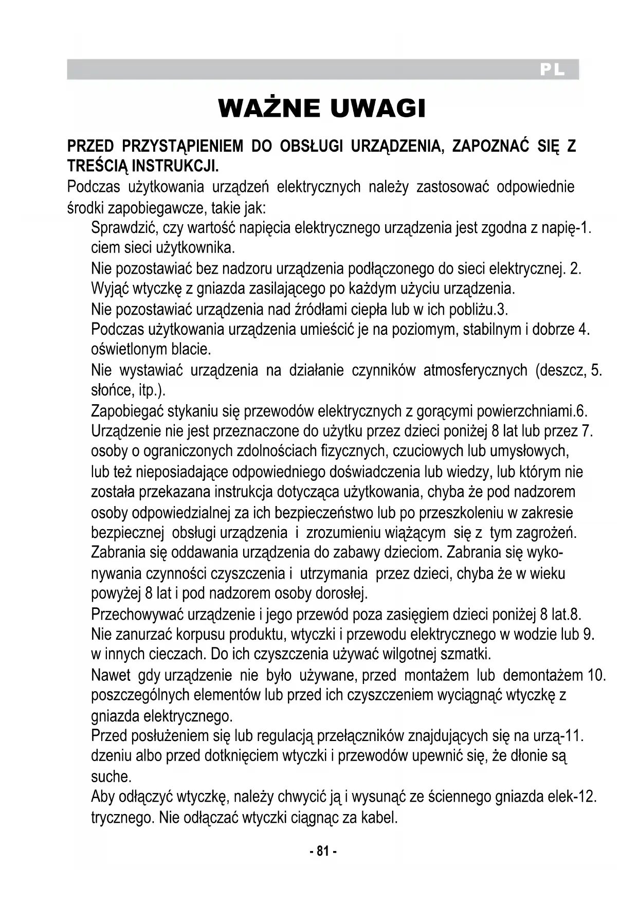 PRZED PRZYSTĄPIENIEM DO OBSŁUGI URZĄDZENIA, ZAPOZNAĆ SIĘ Z TREŚCIĄ INSTRUKCJI. Podczas użytkowania urządzeń elektrycznych należy zastosować odpowiednie środki zapobiegawcze, takie jak: Sprawdzić, czy wartość napięcia elektrycznego urządzenia jest zgodna z napię-1. ciem sieci użytkownika. Nie pozostawiać bez nadzoru urządzenia podłączonego do sieci elektrycznej. 2. Wyjąć wtyczkę z gniazda zasilającego po każdym użyciu urządzenia. Nie pozostawiać urządzenia nad źródłami ciepła lub w ich pobliżu.3. Podczas użytkowania urządzenia umieścić je na poziomym, stabilnym i dobrze 4. oświetlonym blacie. Nie wystawiać urządzenia na działanie czynników atmosferycznych (deszcz, 5. słońce, itp.). Zapobiegać stykaniu się przewodów elektrycznych z gorącymi powierzchniami.6. Urządzenie nie jest przeznaczone do użytku przez dzieci poniżej 8 lat lub przez 7. osoby o ograniczonych zdolnościach fizycznych, czuciowych lub umysłowych, lub też nieposiadające odpowiedniego doświadczenia lub wiedzy, lub którym nie została przekazana instrukcja dotycząca użytkowania, chyba że pod nadzorem osoby odpowiedzialnej za ich bezpieczeństwo lub po przeszkoleniu w zakresie bezpiecznej obsługi urządzenia i zrozumieniu wiążącym się z tym zagrożeń. Zabrania się oddawania urządzenia do zabawy dzieciom. Zabrania się wyko- nywania czynności czyszczenia i utrzymania przez dzieci, chyba że w wieku powyżej 8 lat i pod nadzorem osoby dorosłej. Przechowywać urządzenie i jego przewód poza zasięgiem dzieci poniżej 8 lat.8. Nie zanurzać korpusu produktu, wtyczki i przewodu elektrycznego w wodzie lub 9. w innych cieczach. Do ich czyszczenia używać wilgotnej szmatki. Nawet gdy urządzenie nie było używane, przed montażem lub demontażem 10. poszczególnych elementów lub przed ich czyszczeniem wyciągnąć wtyczkę z gniazda elektrycznego. Przed posłużeniem się lub regulacją przełączników znajdujących się na urzą-11. dzeniu albo przed dotknięciem wtyczki i przewodów upewnić się, że dłonie są suche. Aby odłączyć wtyczkę, należy chwycić ją i wysunąć ze ściennego gniazda elek-12. trycznego. Nie odłączać wtyczki ciągnąc za kabel.PL