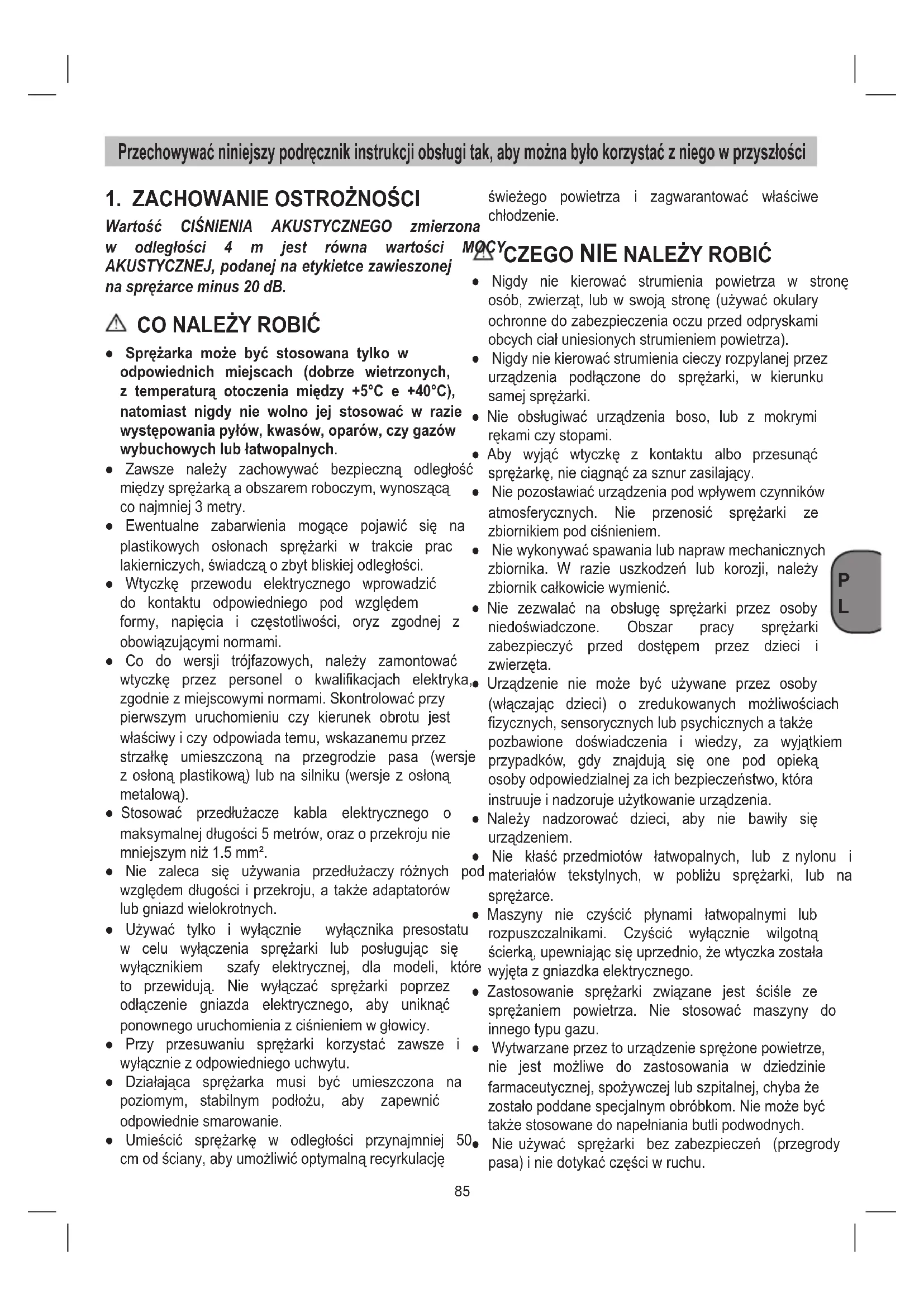 ● Nigdy nie kierować strumienia powietrza w stronę osób,zwierząt,lubwswoją stronę(używaćokulary ochronne do zabezpieczenia oczu przed odpryskami obcychciałuniesionychstrumieniempowietrza). ● Nigdyniekierowaćstrumieniacieczyrozpylanejprzez urządzenia podłączone do sprężarki, w kierunku samejsprężarki. ● Nie obsługiwać urządzenia boso, lub z mokrymi rękamiczystopami. ● Aby wyjąć wtyczkę z kontaktu albo przesunąć sprężarkę,nieciągnąćzasznurzasilający. ● Niepozostawiaćurządzeniapodwpływemczynników atmosferycznych. Nie przenosić sprężarki ze zbiornikiempodciśnieniem. ● Niewykonywaćspawanialubnaprawmechanicznych zbiornika. W razie uszkodzeń lub korozji, należy zbiornikcałkowiciewymienić. ● Nie zezwalać na obsługę sprężarki przez osoby niedoświadczone. Obszar pracy sprężarki zabezpieczyć przed dostępem przez dzieci i zwierzęta. ● Urządzenie nie może być używane przez osoby (włączając dzieci) o zredukowanych możliwościach fizycznych,sensorycznychlubpsychicznychatakże pozbawione doświadczenia i wiedzy, za wyjątkiem przypadków, gdy znajdują się one pod opieką osobyodpowiedzialnejzaichbezpieczeństwo,która instruujeinadzorujeużytkowanieurządzenia. ● Należy nadzorować dzieci, aby nie bawiły się urządzeniem. ● Nie kłaśćprzedmiotów łatwopalnych, lub z nylonu i materiałów tekstylnych, w pobliżu sprężarki, lub na sprężarce. ● Maszyny nie czyścić płynami łatwopalnymi lub rozpuszczalnikami. Czyścić wyłącznie wilgotną ścierką,upewniającsięuprzednio,żewtyczkazostała wyjętazgniazdkaelektrycznego. ● Zastosowanie sprężarki związane jest ściśle ze sprężaniem powietrza. Nie stosować maszyny do innego typu gazu. ● Wytwarzaneprzeztourządzeniesprężonepowietrze, nie jest możliwe do zastosowania w dziedzinie farmaceutycznej,spożywczejlubszpitalnej,chybaże zostałopoddanespecjalnymobróbkom.Niemożebyć takżestosowanedonapełnianiabutlipodwodnych. ● Nieużywać sprężarki bezzabezpieczeń (przegrody pasa)iniedotykaćczęściwruchu. Przechowywać niniejszy podręcznik instrukcji obsługi tak, aby można było korzystać z niego w przyszłości86
