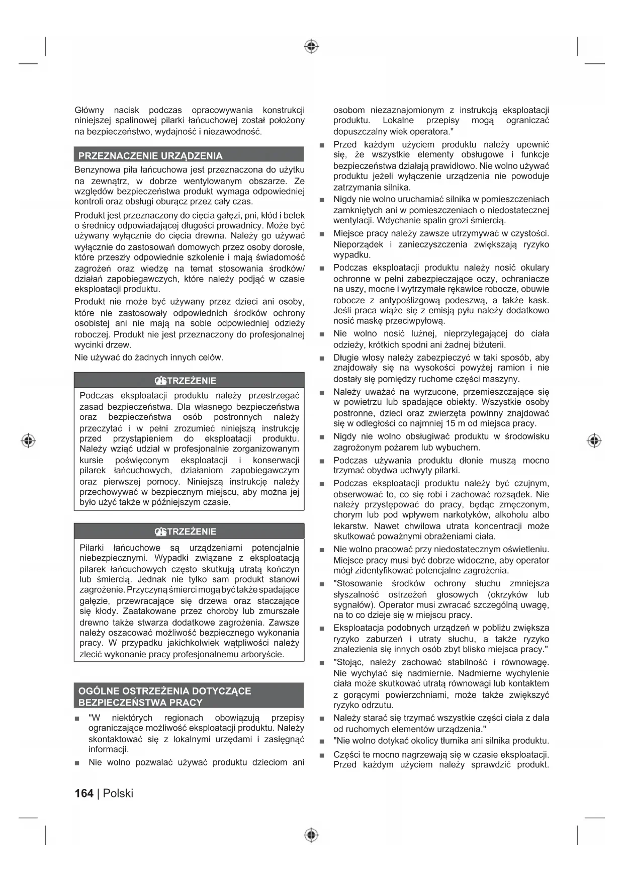 Podczas eksploatacji produktu nalezy przyestrzegać zasad bezpieczenstwa. Dla wlasné beziepćzeniastwa oraz bezpieczenstwa osob postronnych nalezy przyeczytc i w pelni zrozumiec niniejsza instrukcje przystapieniem do eksploatacji produktu. Nalezy wzią udzial w profesjonalnie zorganizowanym kursie poswieconym eksploatacji i konserwacje pilarek lancuchowych, dzialaniom zapobiegawczym oraz pierwszej pomocy. Niniejsza instrukcje nalezy przechowywc w bezpiecznym.), aby można jej byto uzytc sąze w poźniejszym czasie.