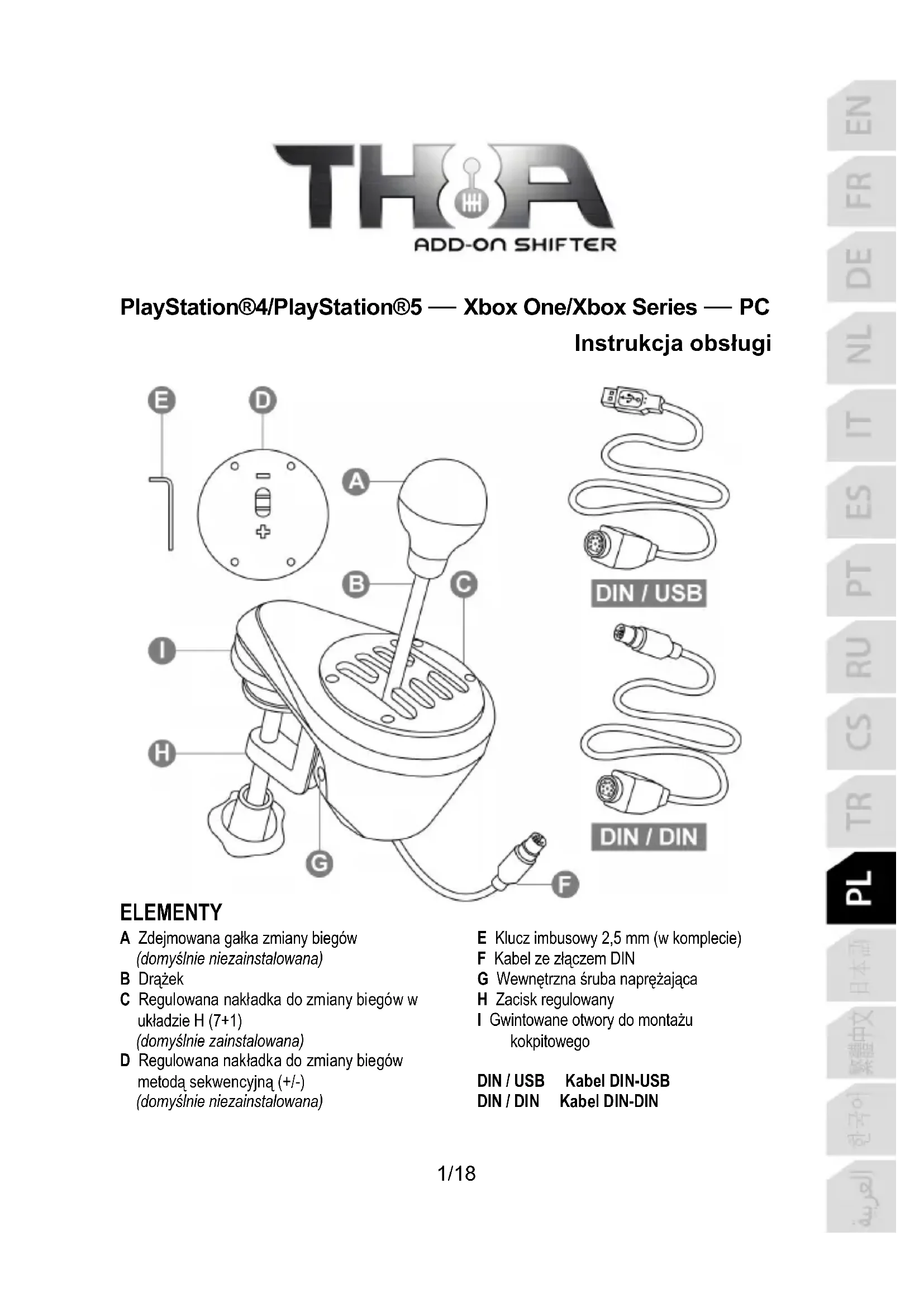 ELEMENTY A Zdejmowana gałka zmiany biegów (domyślnie niezainstalowana) B Drążek C Regulowana nakładka do zmiany biegów w układzie H (7+1) (domyślnie zainstalowana) D Regulowana nakładka do zmiany biegów metodą sekwencyjną (+/-) (domyślnie niezainstalowana) E Klucz imbusowy 2,5 mm (w komplecie) F Kabel ze złączem DIN G Wewnętrzna śruba naprężająca H Zacisk regulowany I Gwintowane otwory do montażu kokpitowego DIN / USB Kabel DIN-USB DIN / DIN Kabel DIN-DIN2/18 OSTRZEŻENIE Zanim rozpoczniesz korzystanie z urządzenia, szczegółowo zapoznaj z niniejszą instrukcją, a następnie zachowaj ją do wglądu. Ostrzeżenie — ryzyko porażenia prądem elektrycznym