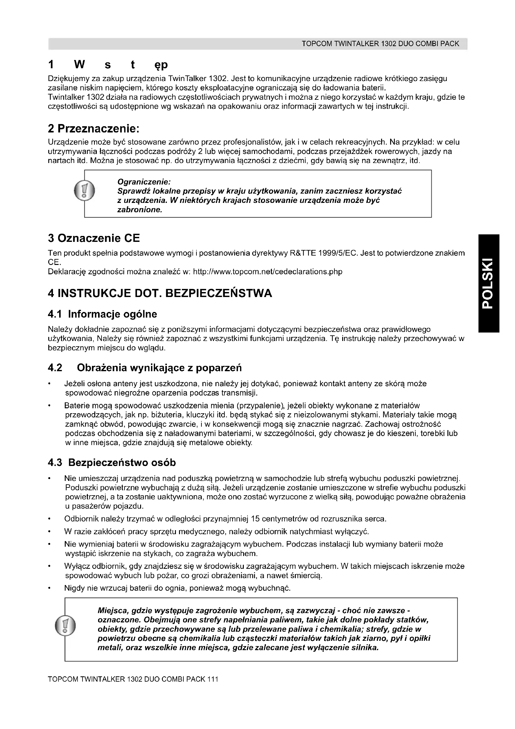 - Nigdy nie wrzucaj baterii do ognia, ponieważ mogą wybuchnąć. Ograniczenie: Sprawdź lokalne przepisy w kraju użytkowania, zanim zaczniesz korzystać zurządzenia. W niektórych krajach stosowanie urządzenia może być zabronione. Miejsca, gdzie występuje zagrożenie wybuchem, są zazwyczaj - choć nie zawsze - oznaczone. Obejmują one strefy napełniania paliwem, takie jak dolne pokłady statków, obiekty, gdzie przechowywane są lub przelewane paliwa i chemikalia; strefy, gdzie w powietrzu obecne są chemikalia lub cząsteczki materiałów takich jak ziarno, pył i opiłki metali, oraz wszelkie inne miejsca, gdzie zalecane jest wyłączenie silnika. HL_TT1302 Duo Combi Pack D63.book Page 111 Sunday, June 5, 2011 10:11 PM112 TOPCOM TWINTALKER 1302 DUO COMBI PACK