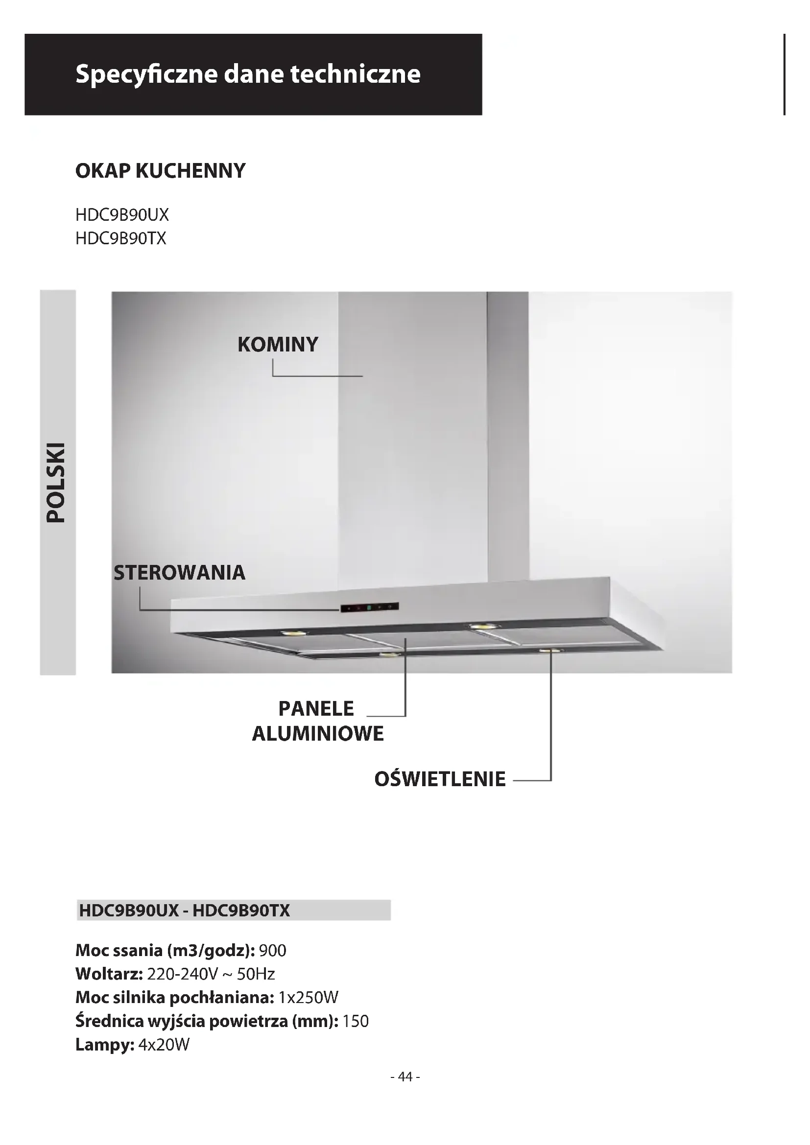 HDC9B90UX - HDC9B90TX Specyczne dane techniczne KOMINY STEROWANIA PANELE ALUMINIOWE OŚWIETLENIE POLSKI OKAP KUCHENNY Moc ssania (m3/godz): 900 Woltarz: 220-240V ~ 50Hz Moc silnika pochłaniana: 1x250W Średnica wyjścia powietrza (mm): 150 Lampy: 4x20W- 45 - POLSKI