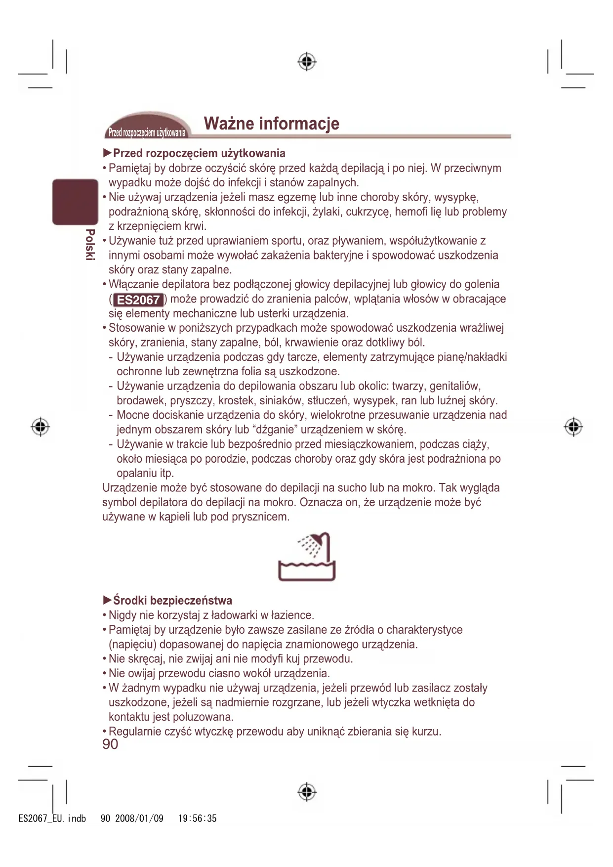 ES2067 ) może prowadzić do zranienia palców, wplątania włosów w obracające się elementy mechaniczne lub usterki urządzenia. Stosowanie w poniższych przypadkach może spowodować uszkodzenia wrażliwej skóry, zranienia, stany zapalne, ból, krwawienie oraz dotkliwy ból. Używanie urządzenia podczas gdy tarcze, elementy zatrzymujące pianę/nakładki ochronne lub zewnętrzna folia są uszkodzone. Używanie urządzenia do depilowania obszaru lub okolic: twarzy, genitaliów, brodawek, pryszczy, krostek, siniaków, stłuczeń, wysypek, ran lub luźnej skóry. Mocne dociskanie urządzenia do skóry, wielokrotne przesuwanie urządzenia nad jednym obszarem skóry lub “dźganie” urządzeniem w skórę. Używanie w trakcie lub bezpośrednio przed miesiączkowaniem, podczas ciąży, około miesiąca po porodzie, podczas choroby oraz gdy skóra jest podrażniona po opalaniu itp. Urządzenie może być stosowane do depilacji na sucho lub na mokro. Tak wygląda symbol depilatora do depilacji na mokro. Oznacza on, że urządzenie może być używane w kąpieli lub pod prysznicem. Środki bezpieczeństwa Nigdy nie korzystaj z ładowarki w łazience. Pamiętaj by urządzenie było zawsze zasilane ze źródła o charakterystyce (napięciu) dopasowanej do napięcia znamionowego urządzenia. Nie skręcaj, nie zwijaj ani nie modyfi kuj przewodu. Nie owijaj przewodu ciasno wokół urządzenia. W żadnym wypadku nie używaj urządzenia, jeżeli przewód lub zasilacz zostały uszkodzone, jeżeli są nadmiernie rozgrzane, lub jeżeli wtyczka wetknięta do kontaktu jest poluzowana. Regularnie czyść wtyczkę przewodu aby uniknąć zbierania się kurzu.