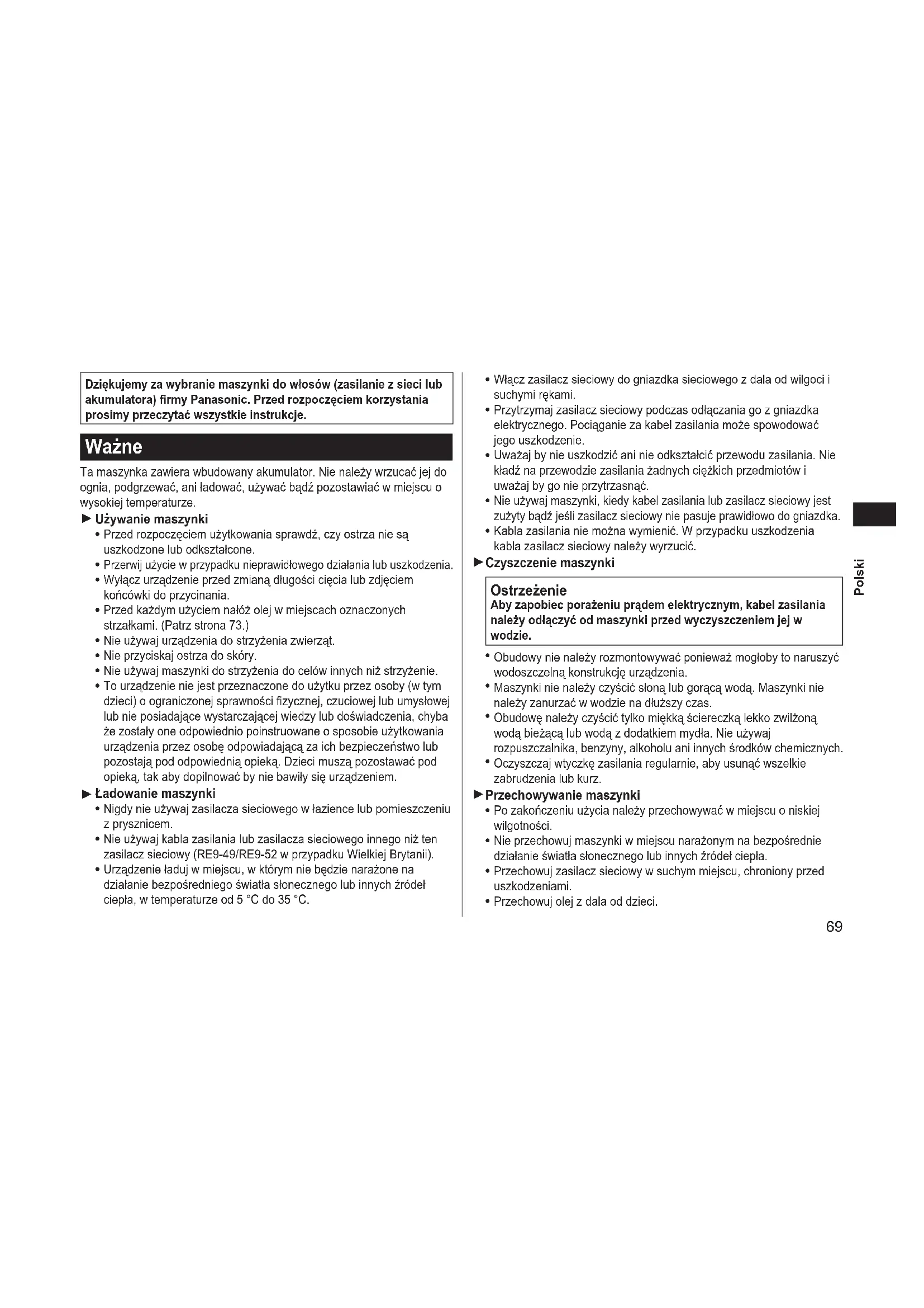 Dziękujemy za wybranie maszynki do włosów (zasilanie z sieci lub akumulatora) rmy Panasonic. Przed rozpoczęciem korzystania prosimy przeczytać wszystkie instrukcje. Ważne Ta maszynka zawiera wbudowany akumulator. Nie należy wrzucać jej do ognia, podgrzewać, ani ładować, używać bądź pozostawiać w miejscu o wysokiej temperaturze. Używanie maszynki Przed rozpoczęciem użytkowania sprawdź, czy ostrza nie są uszkodzone lub odkształcone. Przerwij użycie w przypadku nieprawidłowego działania lub uszkodzenia. Wyłącz urządzenie przed zmianą długości cięcia lub zdjęciem końcówki do przycinania. Przed każdym użyciem nałóż olej w miejscach oznaczonych strzałkami. (Patrz strona 73.) Nie używaj urządzenia do strzyżenia zwierząt. Nie przyciskaj ostrza do skóry. Nie używaj maszynki do strzyżenia do celów innych niż strzyżenie. To urządzenie nie jest przeznaczone do użytku przez osoby (w tym dzieci) o ograniczonej sprawności zycznej, czuciowej lub umysłowej lub nie posiadające wystarczającej wiedzy lub doświadczenia, chyba że zostały one odpowiednio poinstruowane o sposobie użytkowania urządzenia przez osobę odpowiadającą za ich bezpieczeństwo lub pozostają pod odpowiednią opieką. Dzieci muszą pozostawać pod opieką, tak aby dopilnować by nie bawiły się urządzeniem. Ładowanie maszynki Nigdy nie używaj zasilacza sieciowego w łazience lub pomieszczeniu z prysznicem. Nie używaj kabla zasilania lub zasilacza sieciowego innego niż ten zasilacz sieciowy (RE9‑49/RE9‑52 w przypadku Wielkiej Brytanii). Urządzenie ładuj w miejscu, w którym nie będzie narażone na działanie bezpośredniego światła słonecznego lub innych źródeł ciepła, w temperaturze od 5 °C do 35 °C.