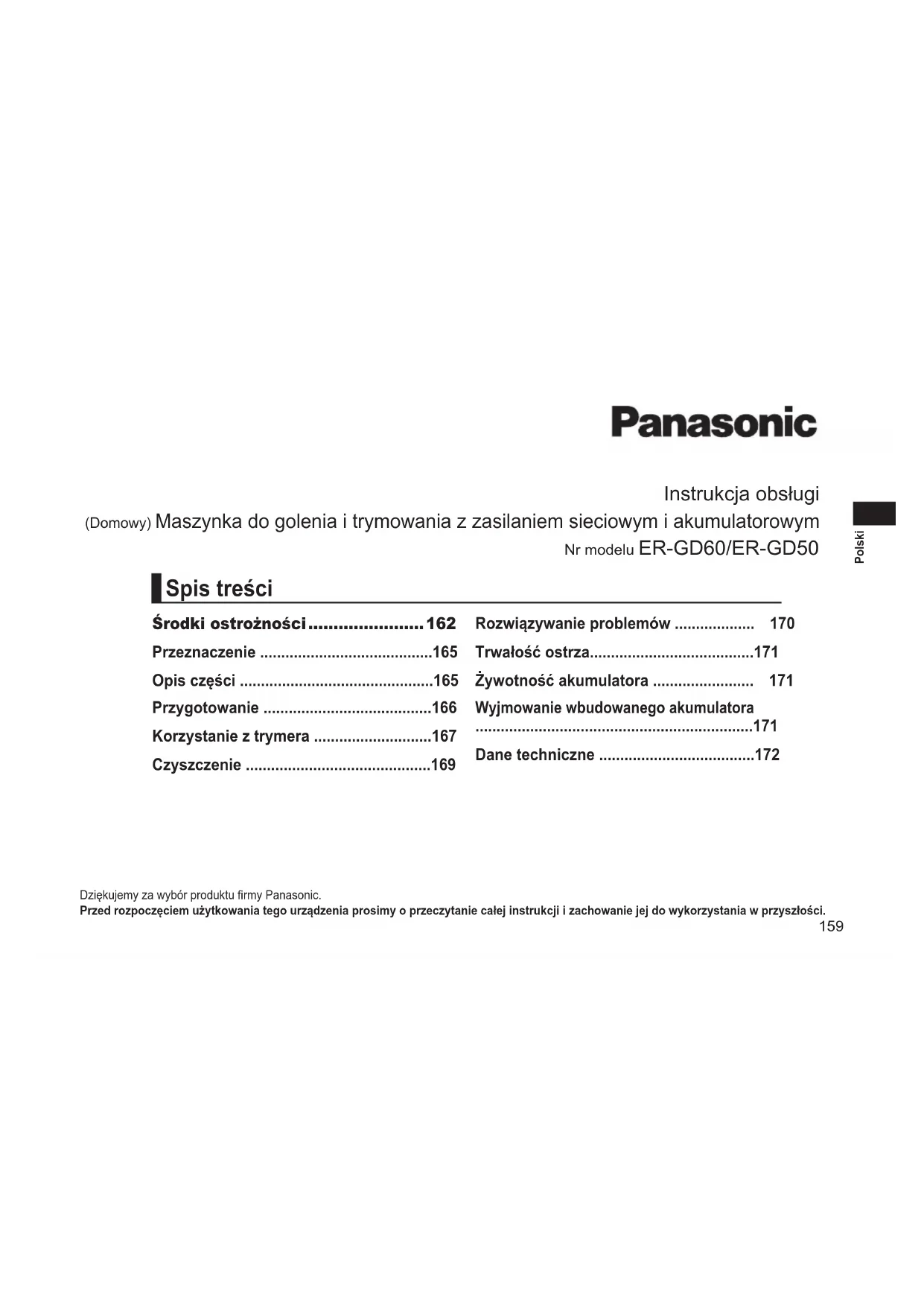 - Ochronaśrodowiskairecyklingmateriałów Trymer zawiera akumulator niklowo‑metalowodorkowy. Upewnij się, że akumulator wyrzucany jest w wyznaczonym punkcie gromadzenia odpadów, jeżeli takie miejsce znajduje się w Twoim kraju.172 Polski Dane techniczne Źródło zasilania Patrz tabliczka znamionowa na zasilaczu. (automatyczna zmiana napięcia zasilania) Napięcie pracy silnika 1,2 V Czas ładowania Około 1 godziny Poziom hałasu 71 (dB (A) re 1 pW) Produkt przeznaczony wyłącznie do użytku domowego. Pozbywaniesięzużytychurządzeńelektrycznychi elektronicznychorazbaterii DotyczywyłącznieobszaruUniiEuropejskiejorazkrajów posiadającychsystemyzbiórkiirecyklingu Niniejsze symbole umieszczane na produktach, opakowaniach i/lub w dokumentacji towarzyszącej oznaczają, że nie wolno mieszać zużytych urządzeń elektrycznych i elektronicznych oraz baterii z innymi odpadami domowymi/komunalnymi. W celu zapewnienia właściwego przetwarzania, utylizacji oraz recyklingu zużytych urządzeń elektrycznych i elektronicznych oraz zużytych baterii, należy oddawać je do wyznaczonych punktów gromadzenia odpadów zgodnie z przepisami prawa krajowego. Poprzez prawidłowe pozbywanie się zużytych urządzeń elektrycznych i elektronicznych oraz zużytych baterii pomagasz oszczędzać cenne zasoby naturalne oraz zapobiegać potencjalnemu negatywnemu wpływowi na zdrowie człowieka oraz na stan środowiska naturalnego. W celu uzyskania informacji o zbiórce oraz recyklingu zużytych urządzeń elektrycznych i elektronicznych oraz baterii prosimy o kontakt z władzami lokalnymi. Za niewłaściwe pozbywanie się tych odpadów mogą grozić kary przewidziane przepisami prawa krajowego. Dotyczysymbolubaterii(symbolponiżej) Ten symbol może występować wraz z symbolem pierwiastka chemicznego. W takim przypadku wymagania Dyrektywy w sprawie określonego środka chemicznego są spełnione.173 Česky Provozní pokyny (Domácí) AC/Dobíjecí zastřihovač vousů Model č. ER‑GD60/ER‑GD50 Děkujeme vám za zakoupení tohoto výrobku Panasonic. Předzahájenímprovozutohotopřístrojesipřečtětevšechnytytopokynyauložtejeprobudoucípoužití. Bezpečnostní opatření p. 176