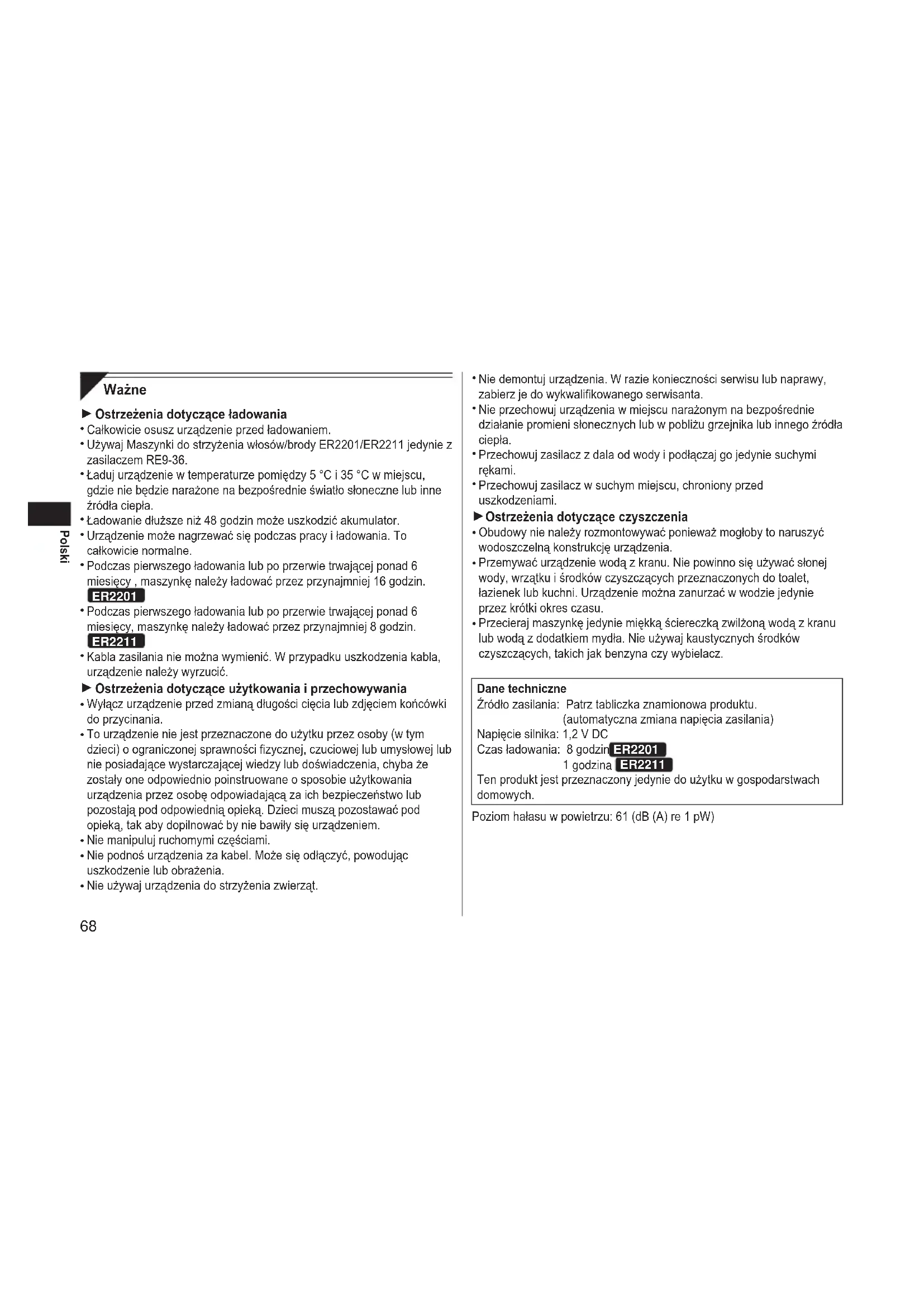 Nie demontuj urządzenia. W razie konieczności serwisu lub naprawy, zabierz je do wykwalikowanego serwisanta. Nie przechowuj urządzenia w miejscu narażonym na bezpośrednie działanie promieni słonecznych lub w pobliżu grzejnika lub innego źródła ciepła. Przechowuj zasilacz z dala od wody i podłączaj go jedynie suchymi rękami. Przechowuj zasilacz w suchym miejscu, chroniony przed uszkodzeniami. Ostrzeżenia dotyczące czyszczenia Obudowy nie należy rozmontowywać ponieważ mogłoby to naruszyć wodoszczelną konstrukcję urządzenia. Przemywać urządzenie wodą z kranu. Nie powinno się używać słonej wody, wrzątku i środków czyszczących przeznaczonych do toalet, łazienek lub kuchni. Urządzenie można zanurzać w wodzie jedynie przez krótki okres czasu. Przecieraj maszynkę jedynie miękką ściereczką zwilżoną wodą z kranu lub wodą z dodatkiem mydła. Nie używaj kaustycznych środków czyszczących, takich jak benzyna czy wybielacz. Dane techniczne Źródło zasilania: Patrz tabliczka znamionowa produktu. (automatyczna zmiana napięcia zasilania) Napięcie silnika: 1,2 V DC Czas ładowania: 8 godzin ER2201 1 godzina ER2211 Ten produkt jest przeznaczony jedynie do użytku w gospodarstwach domowych. Poziom hałasu w powietrzu: 61 (dB (A) re 1 pW)
