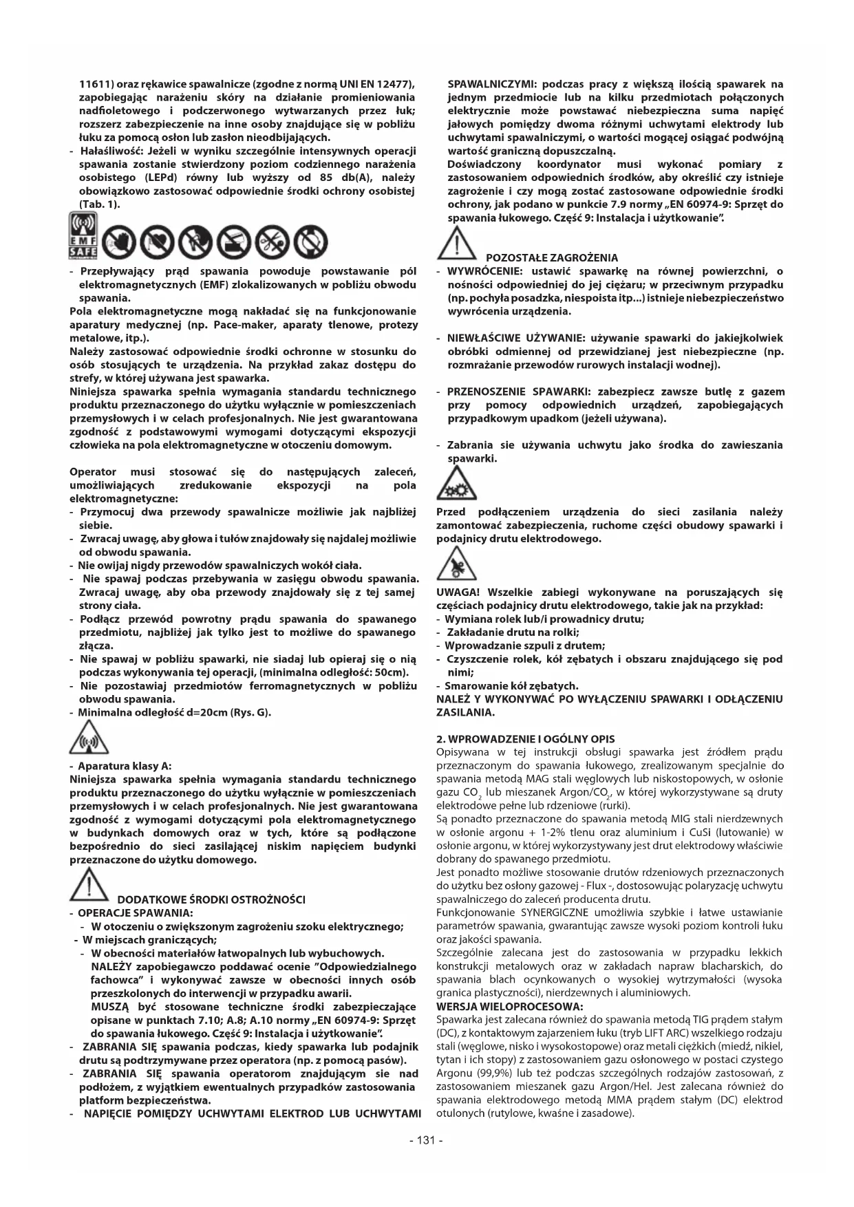 podano w paragrae 1 ”Ogólne bezpieczeństwo podczas spawania łukowego”. Uwaga: Na tabliczce podane jest przykładowe znaczenie symboli i cyfr; dokładne wartości danych technicznych posiadanej spawarki należy odczytać bezpośrednio na tabliczce znajdującej się na spawarce. POZOSTAŁE DANE TECHNICZNE: - SPAWARKA: patrz tabela 1 (TAB. 1) - UCHWYT SPAWALNICZY MIG: patrz tabela 2 (TAB. 2) - UCHWYT SPAWALNICZY TIG: patrz tabela 3 (TAB. 3) - UCHWYT ELEKTRODOWY: patrz tabela 4 (TAB. 4) Ciężar spawarki podany jest w tabeli 1 (TAB. 1).