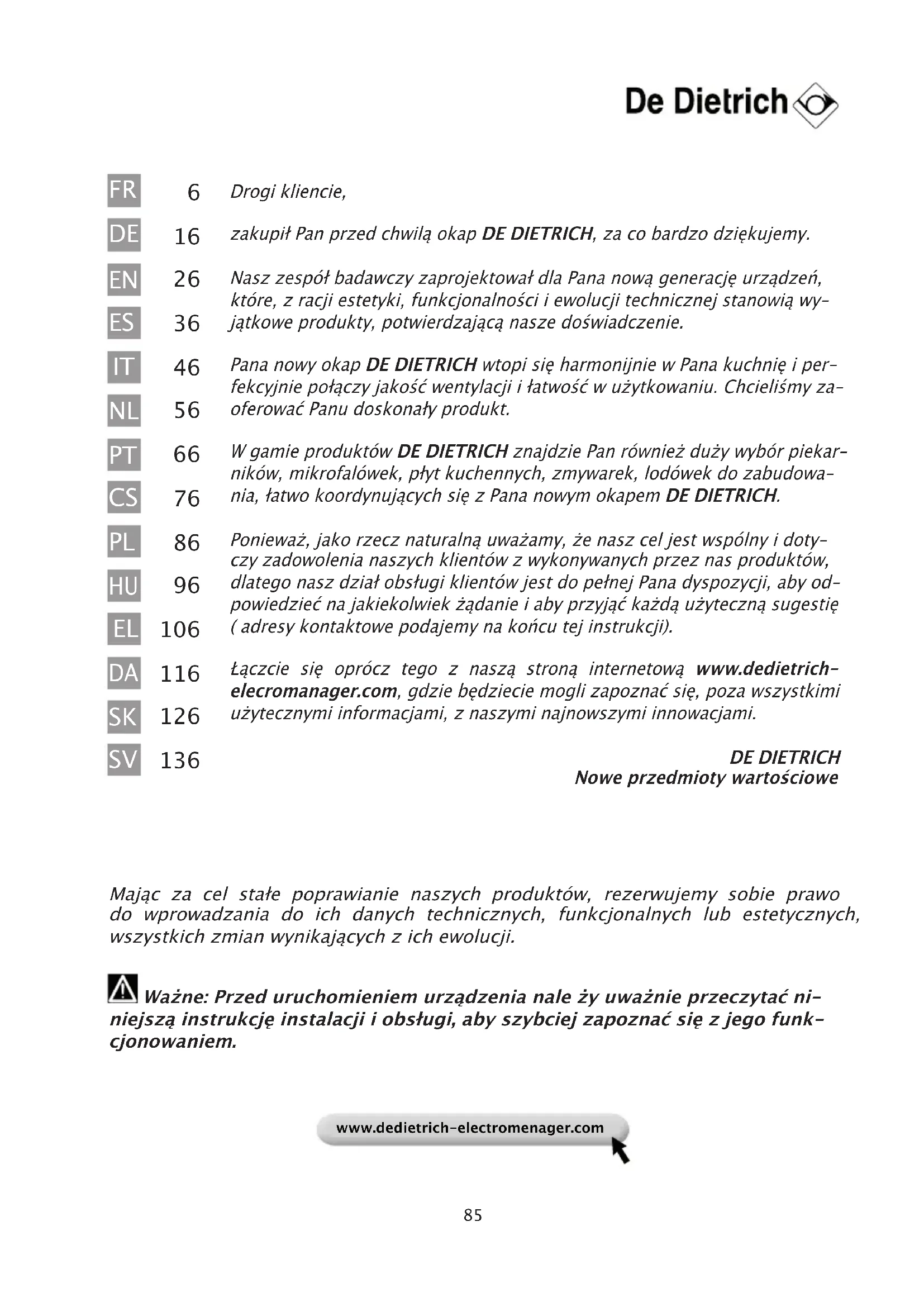 Drogi kliencie, zakupił Pan przed chwilą okap DE DIETRICH, za co bardzo dziękujemy. Nasz zespół badawczy zaprojektował dla Pana nową generację urządzeń, które, z racji estetyki, funkcjonalności i ewolucji technicznej stanowią wy- jątkowe produkty, potwierdzającą nasze doświadczenie. Pana nowy okap DE DIETRICH wtopi się harmonijnie w Pana kuchnię i per- fekcyjnie połączy jakość wentylacji i łatwość w użytkowaniu. Chcieliśmy za- oferować Panu doskonały produkt. W gamie produktów DE DIETRICH znajdzie Pan również duży wybór piekar- ników, mikrofalówek, płyt kuchennych, zmywarek, lodówek do zabudowa- nia, łatwo koordynujących się z Pana nowym okapem DE DIETRICH. Ponieważ, jako rzecz naturalną uważamy, że nasz cel jest wspólny i doty- czy zadowolenia naszych klientów z wykonywanych przez nas produktów, dlatego nasz dział obsługi klientów jest do pełnej Pana dyspozycji, aby od- powiedzieć na jakiekolwiek żądanie i aby przyjąć każdą użyteczną sugestię ( adresy kontaktowe podajemy na końcu tej instrukcji). Łączcie się oprócz tego z naszą stroną internetową www.dedietrich- elecromanager.com, gdzie będziecie mogli zapoznać się, poza wszystkimi użytecznymi informacjami, z naszymi najnowszymi innowacjami. DE DIETRICH Nowe przedmioty wartościowe
