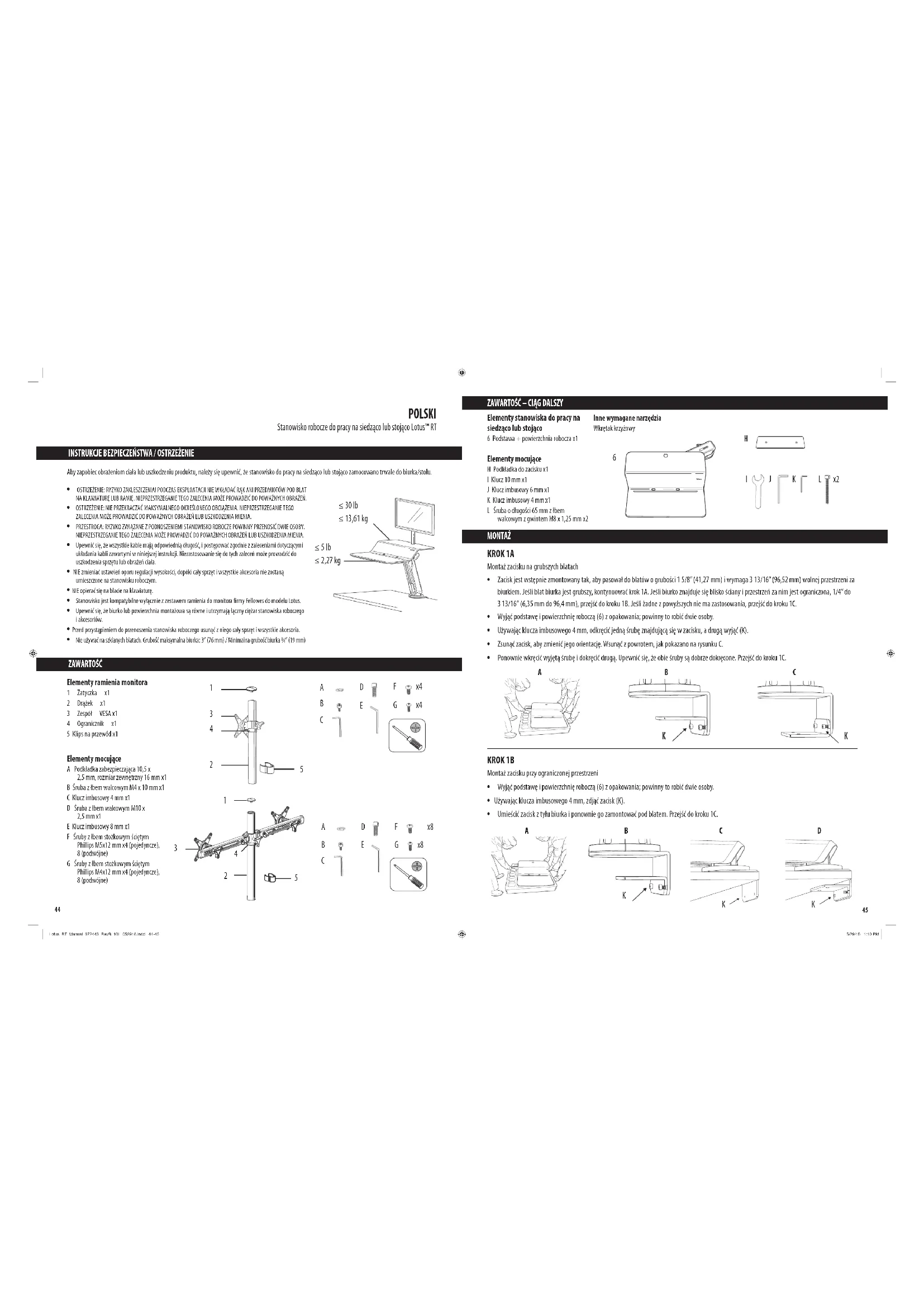 ZAWARTOŚĆ ≤ 30lb ≤ 13,61kg Elementy ramienia monitora 1 Zatyczka x1 2 Drążek x1 3 Zespół VESAx1 4 Ogranicznik x1 5 Klips na przewód x1 Elementy mocujące A Podkładka zabezpieczająca 10,5 x 2,5mm, rozmiar zewnętrzny 16mm x1 B Śruba złbem walcowym M4 x 10mm x1 C Klucz imbusowy 4mm x1 D Śruba złbem walcowym M10 x 2,5mmx1 E Klucz imbusowy 8mm x1 F Śruby złbem stożkowym ściętym Phillips M5x12mm x4 (pojedyncze), 8(podwójne) G Śruby złbem stożkowym ściętym Phillips M4x12mm x4 (pojedyncze), 8(podwójne) Elementy stanowiska do pracy na siedząco lub stojąco 6 Podstawa + powierzchnia robocza x1 Elementy mocujące H Podkładka do zacisku x1 I Klucz 10mm x1 J Klucz imbusowy 6mm x1 K Klucz imbusowy 4mm x1 L Śruba odługości 65mm złbem walcowym zgwintem M8 x 1,25mm x2 Inne wymagane narzędzia Wkrętak krzyżowy