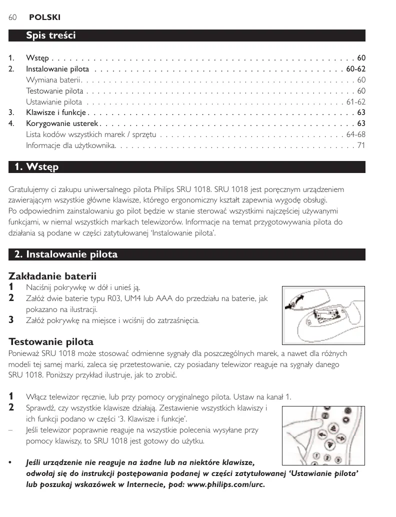Gratulujemy ci zakupu uniwersalnego pilota Philips SRU 1018. SRU 1018 jest poręcznym urządzeniem zawierającym wszystkie główne klawisze, którego ergonomiczny kształt zapewnia wygodę obsługi. Po odpowiednim zainstalowaniu go pilot będzie w stanie sterować wszystkimi najczęściej używanymi funkcjami, w niemal wszystkich markach telewizorów. Informacje na temat przygotowywania pilota do działania są podane w części zatytułowanej ‘Instalowanie pilota’.