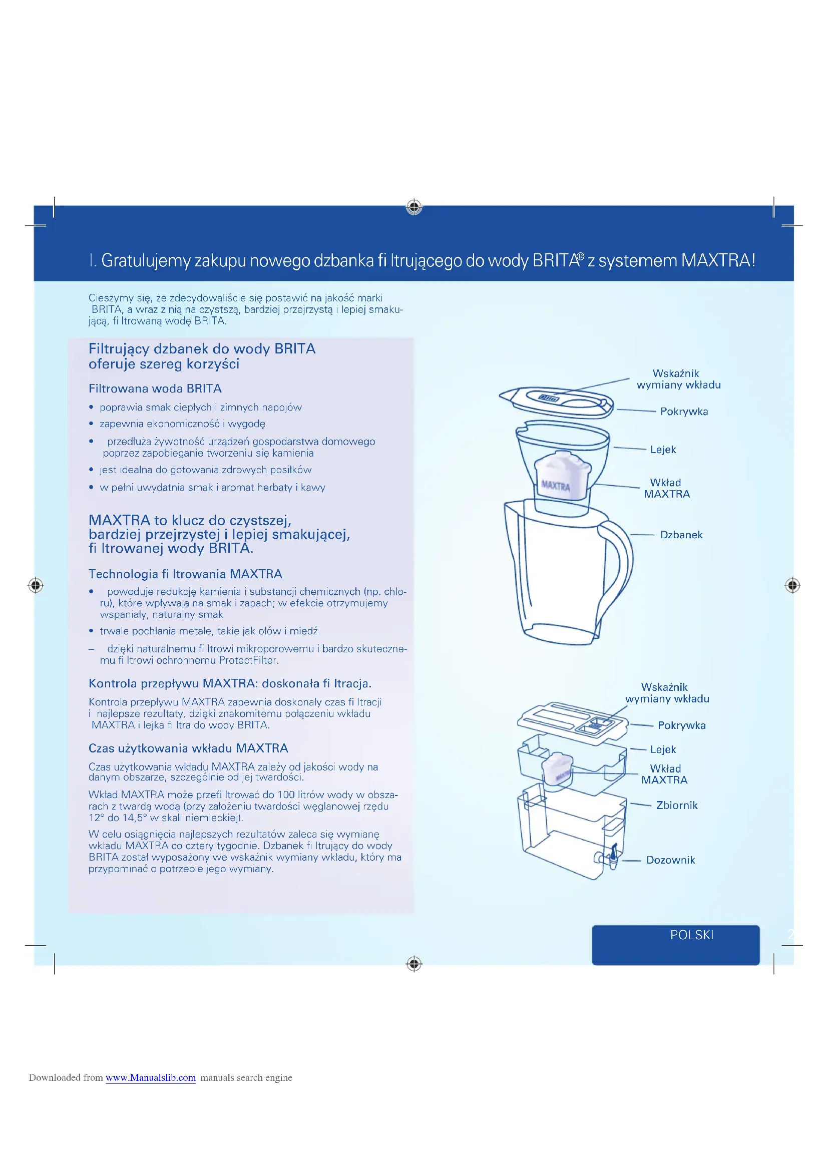 - powoduje redukcję kamienia i substancji chemicznych (np. chlo-ru), które wpływają na smak i zapach; w efekcie otrzymujemy wspaniały, naturalny smak• trwale pochłania metale, takie jak ołów i miedź– dzięki naturalnemu fi ltrowi mikroporowemu i bardzo skuteczne-mu fi ltrowi ochronnemu ProtectFilter. Kontrola przepływu MAXTRA: doskonała fi ltracja. Kontrola przepływu MAXTRA zapewnia doskonały czas fi ltracji i najlepsze rezultaty, dzięki znakomitemu połączeniu wkładu MAXTRA i lejka fi ltra do wody BRITA. Czas użytkowania wkładu MAXTRA Czas użytkowania wkładu MAXTRA zależy od jakości wody na danym obszarze, szczególnie od jej twardości.Wkład MAXTRA może przefi ltrować do 100 litrów wody w obsza-rach z twardą wodą (przy założeniu twardości węglanowej rzędu 12° do 14,5° w skali niemieckiej).W celu osiągnięcia najlepszych rezultatów zaleca się wymianę wkładu MAXTRA co cztery tygodnie. Dzbanek fi ltrujący do wody BRITA został wyposażony we wskaźnik wymiany wkładu, który ma przypominać o potrzebie jego wymiany. Downloaded from www.Manualslib.com manuals search engine28 POLSKI