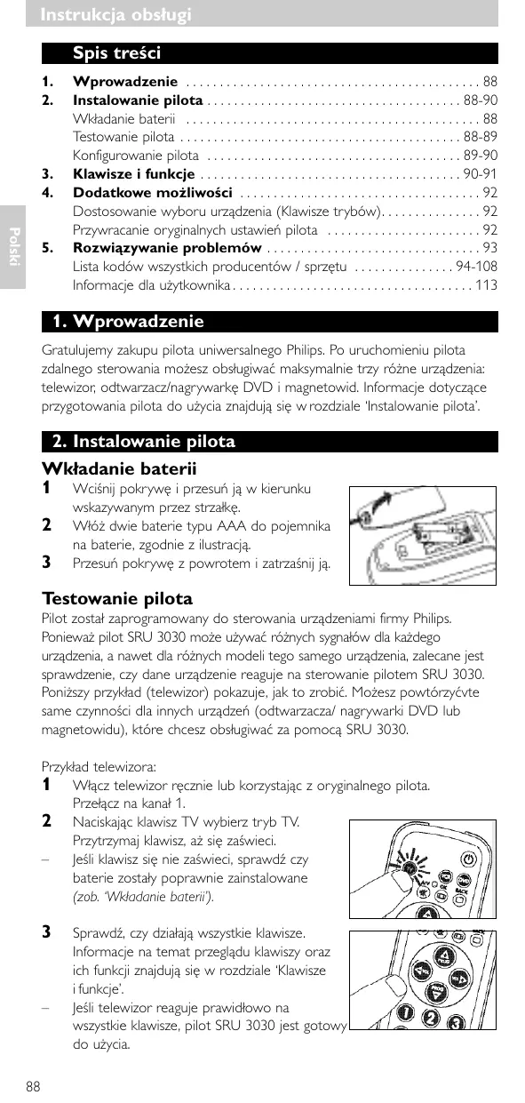 Wprowadzenie . . . . . . . . . . . . . . . . . . . . . . . . . . . . . . . . . . . . . . . . . . . . 88 Instalowanie pilota . . . . . . . . . . . . . . . . . . . . . . . . . . . . . . . . . . . . . . 88-90 Wkładanie baterii . . . . . . . . . . . . . . . . . . . . . . . . . . . . . . . . . . . . . . . . . . . . 88 Testowanie pilota . . . . . . . . . . . . . . . . . . . . . . . . . . . . . . . . . . . . . . . . . . 88-89 Konfigurowanie pilota . . . . . . . . . . . . . . . . . . . . . . . . . . . . . . . . . . . . . . 89-90 Klawisze i funkcje . . . . . . . . . . . . . . . . . . . . . . . . . . . . . . . . . . . . . . . 90-91 Dodatkowe możliwości . . . . . . . . . . . . . . . . . . . . . . . . . . . . . . . . . . . . 92 Dostosowanie wyboru urządzenia (Klawisze trybów). . . . . . . . . . . . . . . 92 Przywracanie oryginalnych ustawień pilota . . . . . . . . . . . . . . . . . . . . . . . 92 Rozwiązywanie problemów . . . . . . . . . . . . . . . . . . . . . . . . . . . . . . . . 93 Lista kodów wszystkich producentów / sprzętu . . . . . . . . . . . . . . . 94-108 Informacje dla użytkownika . . . . . . . . . . . . . . . . . . . . . . . . . . . . . . . . . . . . 113