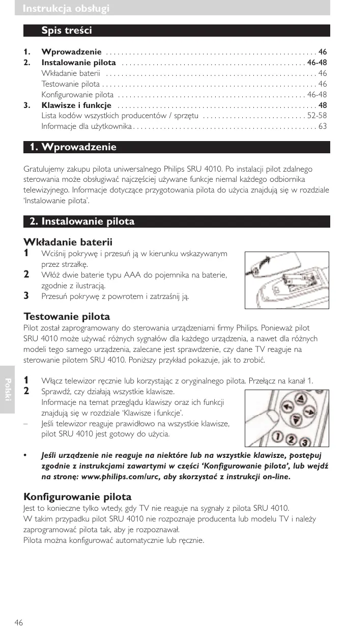Wprowadzenie . . . . . . . . . . . . . . . . . . . . . . . . . . . . . . . . . . . . . . . . . . . . . . . . . . . . . . . 46 Instalowanie pilota . . . . . . . . . . . . . . . . . . . . . . . . . . . . . . . . . . . . . . . . . . . . . . . . 46-48 Wkładanie baterii . . . . . . . . . . . . . . . . . . . . . . . . . . . . . . . . . . . . . . . . . . . . . . . . . . . . . . . 46 Testowanie pilota . . . . . . . . . . . . . . . . . . . . . . . . . . . . . . . . . . . . . . . . . . . . . . . . . . . . . . . . 46 Konfigurowanie pilota . . . . . . . . . . . . . . . . . . . . . . . . . . . . . . . . . . . . . . . . . . . . . . . . . 46-48 Klawisze i funkcje . . . . . . . . . . . . . . . . . . . . . . . . . . . . . . . . . . . . . . . . . . . . . . . . . . . . 48 Lista kodów wszystkich producentów / sprzętu . . . . . . . . . . . . . . . . . . . . . . . . . . . 52-58 Informacje dla użytkownika . . . . . . . . . . . . . . . . . . . . . . . . . . . . . . . . . . . . . . . . . . . . . . . . 63