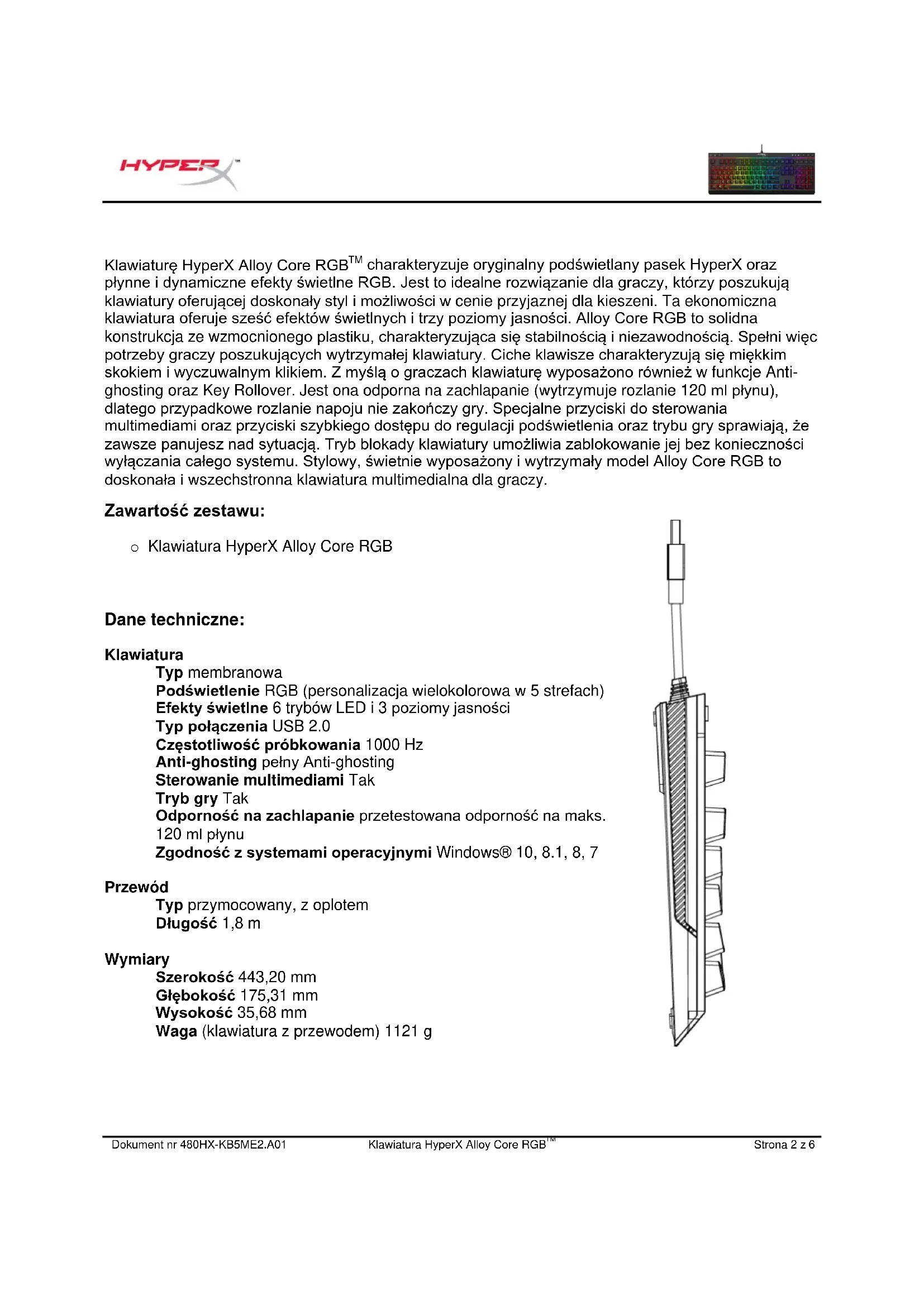 † Więcej informacji zawiera poniższa tabela.Dokument nr 480HX-KB5ME2.A01 Klawiatura HyperX Alloy Core RGB