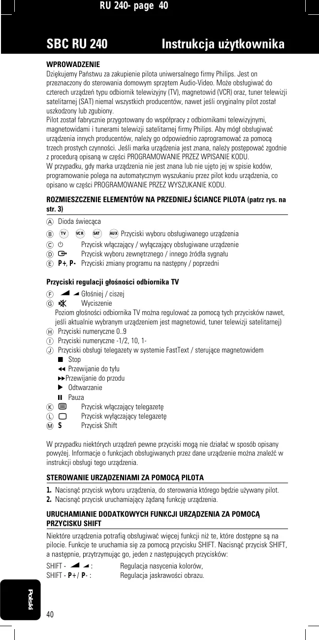 WPROWADZENIE Dziêkujemy Pañstwu za zakupienie pilota uniwersalnego firmy Philips. Jest on przeznaczony do sterowania domowym sprzêtem Audio-Video. Mo¿e obs¬ugiwaæ do czterech urzådzeñ typu odbiornik telewizyjny (TV), magnetowid (VCR) oraz, tuner telewizji satelitarnej (SAT) niemal wszystkich producentów, nawet jeœli oryginalny pilot zosta¬ uszkodzony lub zgubiony. Pilot zosta¬ fabrycznie przygotowany do wspó¬pracy z odbiornikami telewizyjnymi, magnetowidami i tunerami telewizji satelitarnej firmy Philips. Aby móg¬ obs¬ugiwaæ urzådzenia innych producentów, nale¿y go odpowiednio zaprogramowaæ za pomocå trzech prostych czynnoœci. Jeœli marka urzådzenia jest znana, nale¿y postêpowaæ zgodnie z procedurå opisanå w czêœci PROGRAMOWANIE PRZEZ WPISANIE KODU. W przypadku, gdy marka urzådzenia nie jest znana lub nie ujêto jej w spisie kodów, programowanie polega na automatycznym wyszukaniu przez pilot kodu urzådzenia, co opisano w czêœci PROGRAMOWANIE PRZEZ WYSZUKANIE KODU. ROZMIESZCZENIE ELEMENTÓW NA PRZEDNIEJ ŒCIANCE PILOTA (patrz rys. na str. 3) A Dioda œwiecåca B TV VCR SAT AUX Przyciski wyboru obs¬ugiwanego urzådzenia C y Przycisk w¬åczajåcy / wy¬åczajåcy obs¬ugiwane urzådzenie D † Przycisk wyboru zewnêtrznego / innego Ÿród¬a sygna¬u E P+, P- Przyciski zmiany programu na nastêpny / poprzedni Przyciski regulacji g¬oœnoœci odbiornika TV F G¬oœniej / ciszej G c Wyciszenie Poziom g¬oœnoœci odbiornika TV mo¿na regulowaæ za pomocå tych przycisków nawet, jeœli aktualnie wybranym urzådzeniem jest magnetowid, tuner telewizji satelitarnej) H Przyciski numeryczne 0..9 I Przyciski numeryczne -1/2, 10, 1J Przyciski obs¬ugi telegazety w systemie FastText / sterujåce magnetowidem 9 Stop 5 Przewijanie do ty¬u 6Przewijanie do przodu 2 Odtwarzanie ; Pauza K b Przycisk w¬åczajåcy telegazetê L I Przycisk wy¬åczajåcy telegazetê M S Przycisk Shift W przypadku niektórych urzådzeñ pewne przyciski mogå nie dzia¬aæ w sposób opisany powy¿ej. Informacje o funkcjach obs¬ugiwanych przez dane urzådzenie mo¿na znaleŸæ w instrukcji obs¬ugi tego urzådzenia. STEROWANIE URZÅDZENIAMI ZA POMOCÅ PILOTA 1. Nacisnåæ przycisk wyboru urzådzenia, do sterowania którego bêdzie u¿ywany pilot. 2. Nacisnåæ przycisk uruchamiajåcy ¿ådanå funkcjê urzådzenia. URUCHAMIANIE DODATKOWYCH FUNKCJI URZÅDZENIA ZA POMOCÅ PRZYCISKU SHIFT Niektóre urzådzenia potrafiå obs¬ugiwaæ wiêcej funkcji ni¿ te, które dostêpne så na pilocie. Funkcje te uruchamia siê za pomocå przycisku SHIFT. Nacisnåæ przycisk SHIFT, a nastêpnie, przytrzymujåc go, jeden z nastêpujåcych przycisków: SHIFT : SHIFT - P+ / P- :