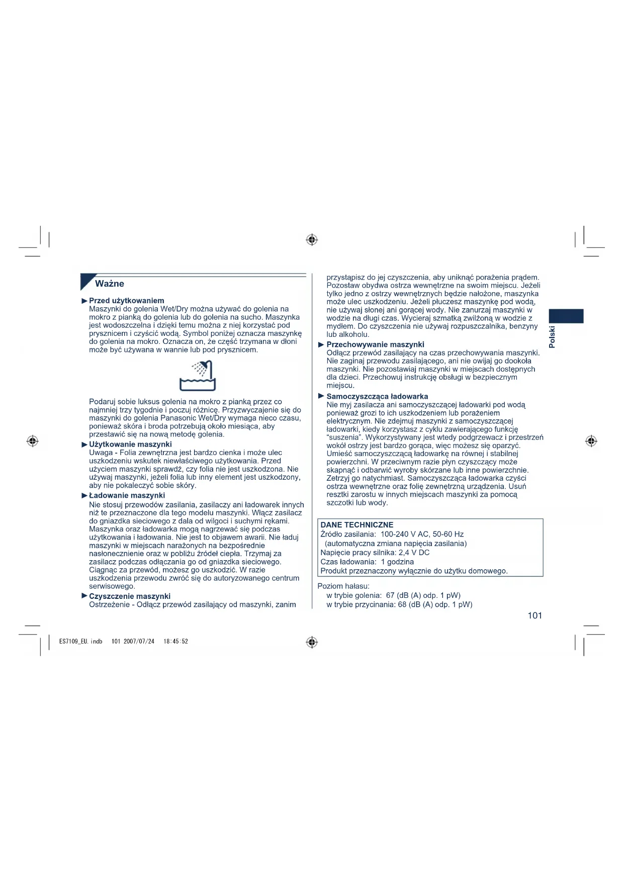 ES7109_EU.indb 100 2007/07/24 18:45:52101 Polski Ważne Przed użytkowaniem Maszynki do golenia Wet/Dry można używać do golenia na mokro z pianką do golenia lub do golenia na sucho. Maszynka jest wodoszczelna i dzięki temu można z niej korzystać pod prysznicem i czyścić wodą. Symbol poniżej oznacza maszynkę do golenia na mokro. Oznacza on, że część trzymana w dłoni może być używana w wannie lub pod prysznicem. Podaruj sobie luksus golenia na mokro z pianką przez co najmniej trzy tygodnie i poczuj różnicę. Przyzwyczajenie się do maszynki do golenia Panasonic Wet/Dry wymaga nieco czasu, ponieważ skóra i broda potrzebują około miesiąca, aby przestawić się na nową metodę golenia. Użytkowanie maszynki Uwaga - Folia zewnętrzna jest bardzo cienka i może ulec uszkodzeniu wskutek niewłaściwego użytkowania. Przed użyciem maszynki sprawdź, czy folia nie jest uszkodzona. Nie używaj maszynki, jeżeli folia lub inny element jest uszkodzony, aby nie pokaleczyć sobie skóry. Ładowanie maszynki Nie stosuj przewodów zasilania, zasilaczy ani ładowarek innych niż te przeznaczone dla tego modelu maszynki. Włącz zasilacz do gniazdka sieciowego z dala od wilgoci i suchymi rękami. Maszynka oraz ładowarka mogą nagrzewać się podczas użytkowania i ładowania. Nie jest to objawem awarii. Nie ładuj maszynki w miejscach narażonych na bezpośrednie nasłonecznienie oraz w pobliżu źródeł ciepła. Trzymaj za zasilacz podczas odłączania go od gniazdka sieciowego. Ciągnąc za przewód, możesz go uszkodzić. W razie uszkodzenia przewodu zwróć się do autoryzowanego centrum serwisowego. Czyszczenie maszynki Ostrzeżenie - Odłącz przewód zasilający od maszynki, zanim
