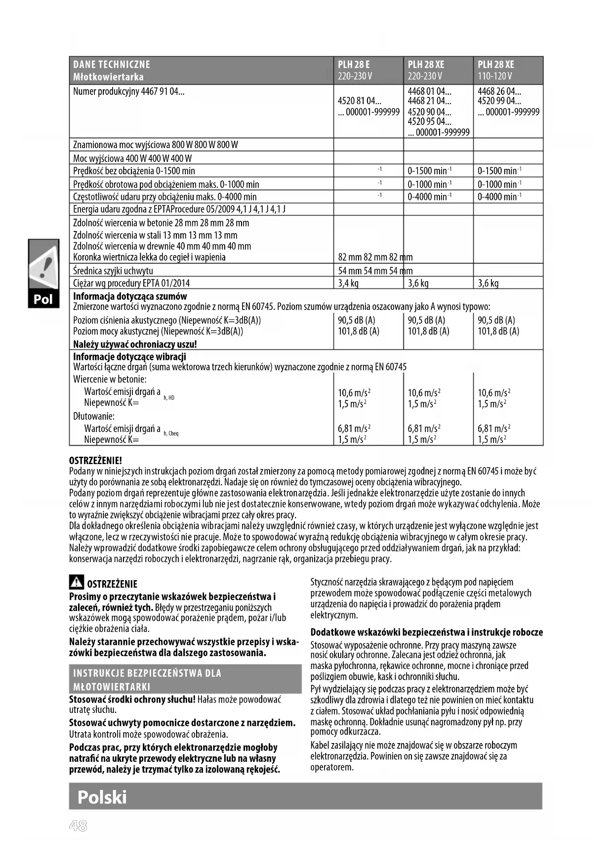 Energia udaru zgodna z EPTAProcedure 05/2009 4,1 J 4,1 J 4,1 J Zdolność wiercenia w betonie 28 mm 28 mm 28 mm Zdolność wiercenia w stali 13 mm 13 mm 13 mm Zdolność wiercenia w drewnie 40 mm 40 mm 40 mm Koronka wiertnicza lekka do cegieł i wapienia 82 mm 82 mm 82 mm Średnica szyjki uchwytu 54 mm 54 mm 54 mm Ciężar wg procedury EPTA 01/2014 3,4 kg 3,6 kg 3,6 kg Informacja dotycząca szumów Zmierzone wartości wyznaczono zgodnie z normą EN 60745. Poziom szumów urządzenia oszacowany jako A wynosi typowo: Poziom ciśnienia akustycznego (Niepewność K=3dB(A)) Poziom mocy akustycznej (Niepewność K=3dB(A)) 90,5 dB (A) 101,8 dB (A) 90,5 dB (A) 101,8 dB (A) 90,5 dB (A) 101,8 dB (A) Należy używać ochroniaczy uszu! Informacje dotyczące wibracji Wartości łączne drgań (suma wektorowa trzech kierunków) wyznaczone zgodnie z normą EN 60745 Wiercenie w betonie: Wartość emisji drgań a h, HD Niepewność K= 10,6 m/s