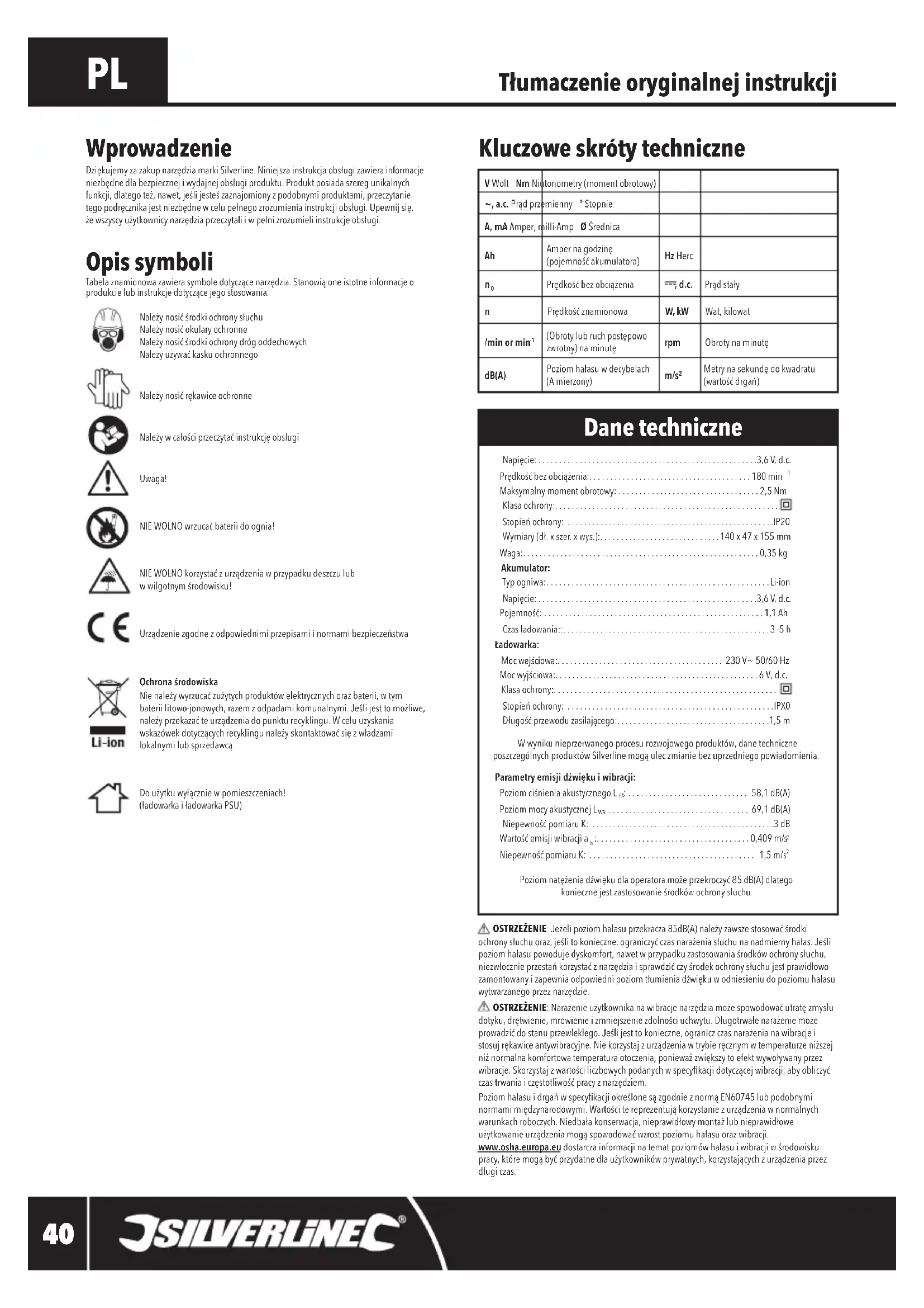 Dziegujemy za zakup naręźdia marki Silverline. Niniejsza instrukcja oblsugi zawiera informacja niedzbie dane bezpiecznej i wydajnej oblsugi produktu. Produkt posida szereg unikalnych funkci, dlatego tez, nawe, jesti jeste zaznajomniy z podobnym produktami, przechyzanie togo podrzniczniet jest niedzbie w celu pelné zo RGBiemia instructkji oblsugi. Upewnij sie, ze wsyszcy uzytkownicy narȩźdia przyczytali i w pelni zrozumieli instructkcje oblsugi.