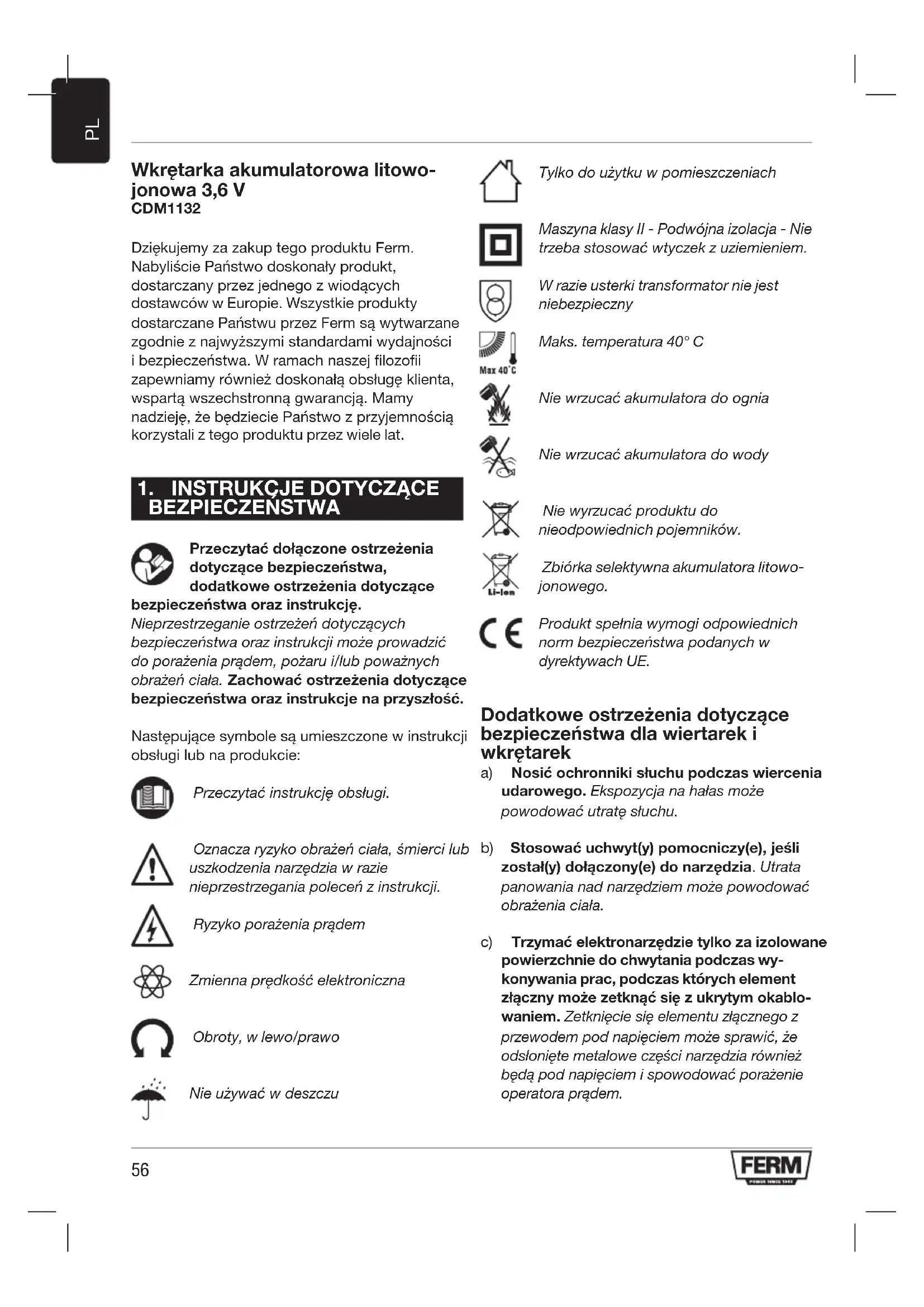 Wkrętarka akumulatorowa litowo- jonowa 3,6 V CDM1132 Dziękujemy za zakup tego produktu Ferm. Nabyliście Państwo doskonały produkt, dostarczany przez jednego z wiodących dostawców w Europie. Wszystkie produkty dostarczane Państwu przez Ferm są wytwarzane zgodnie z najwyższymi standardami wydajności i bezpieczeństwa. W ramach naszej filozofii zapewniamy również doskonałą obsługę klienta, wspartą wszechstronną gwarancją. Mamy nadzieję, że będziecie Państwo z przyjemnością korzystali z tego produktu przez wiele lat.