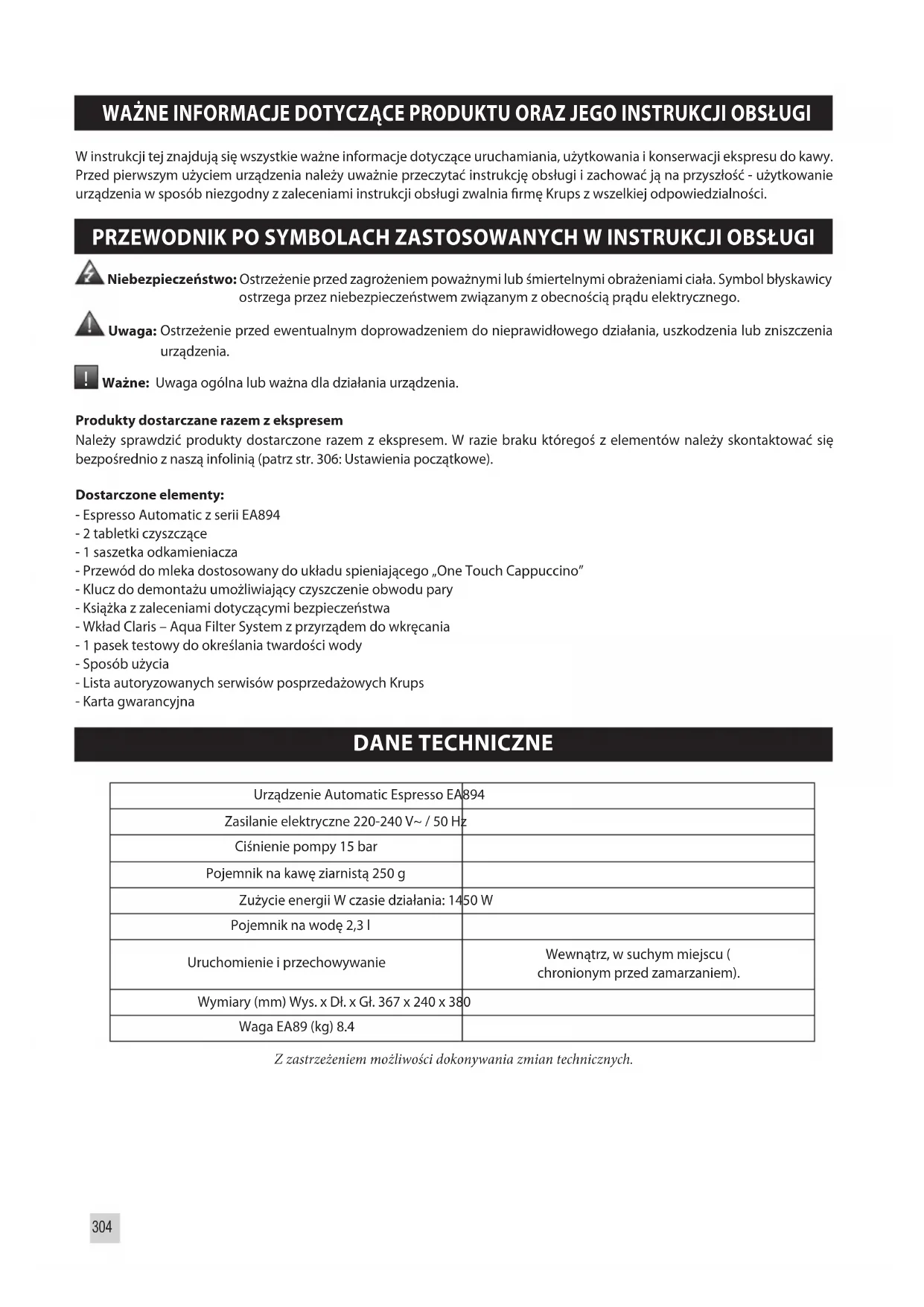 Ważne: Uwaga ogólna lub ważna dla działania urządzenia. Produkty dostarczane razem z ekspresem Należy sprawdzić produkty dostarczone razem z ekspresem. W razie braku któregoś z elementów należy skontaktować się bezpośrednio z naszą infolinią (patrz str. 306: Ustawienia początkowe). Dostarczone elementy: - Espresso Automatic z serii EA894 - 2 tabletki czyszczące - 1 saszetka odkamieniacza - Przewód do mleka dostosowany do układu spieniającego „One Touch Cappuccino” - Klucz do demontażu umożliwiający czyszczenie obwodu pary - Książka z zaleceniami dotyczącymi bezpieczeństwa - Wkład Claris – Aqua Filter System z przyrządem do wkręcania - 1 pasek testowy do określania twardości wody - Sposób użycia - Lista autoryzowanych serwisów posprzedażowych Krups - Karta gwarancyjna DANE TECHNICZNE Urządzenie Automatic Espresso EA894 Zasilanie elektryczne 220-240 V~ / 50 Hz Ciśnienie pompy 15 bar Pojemnik na kawę ziarnistą 250 g Zużycie energii W czasie działania: 1450 W Pojemnik na wodę 2,3 l Uruchomienie i przechowywanie Wewnątrz, w suchym miejscu ( chronionym przed zamarzaniem). Wymiary (mm) Wys. x Dł. x Gł. 367 x 240 x 380 Waga EA89 (kg) 8.4 Z zastrzeżeniem możliwości dokonywania zmian technicznych.