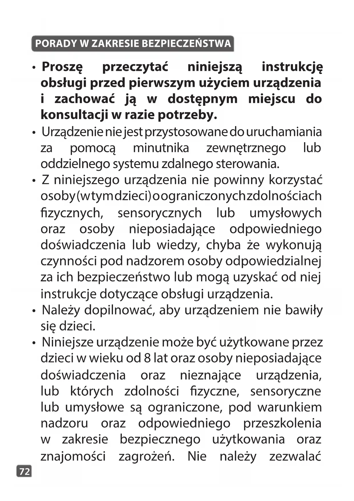 - Niniejsze urządzenie może być użytkowane przez dzieci w wieku od 8 lat oraz osoby nieposiadające doświadczenia oraz nieznające urządzenia, lub których zdolności zyczne, sensoryczne lub umysłowe są ograniczone, pod warunkiem nadzoru oraz odpowiedniego przeszkolenia w zakresie bezpiecznego użytkowania oraz znajomości zagrożeń. Nie należy zezwalać73