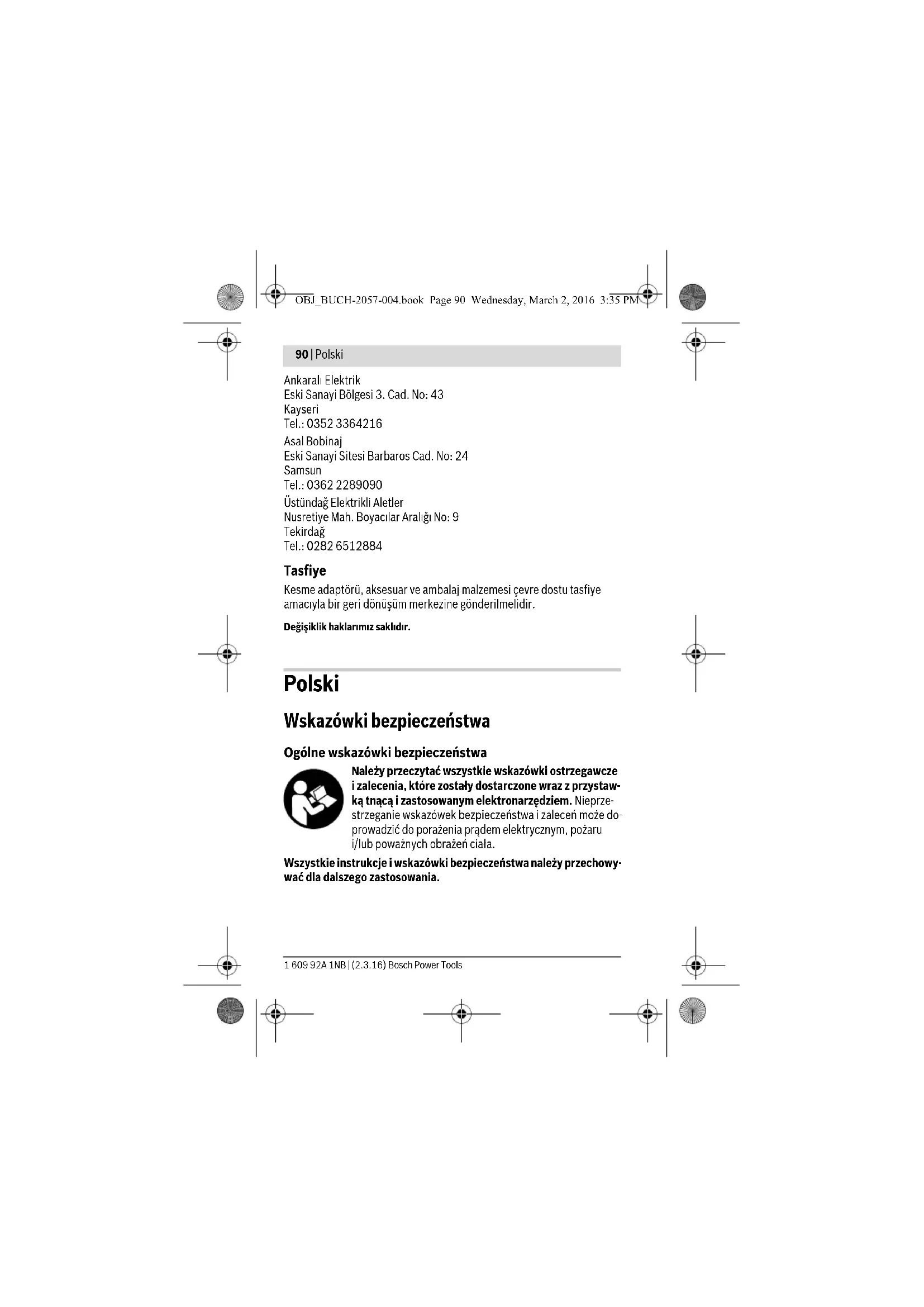 Denizli Tel.: 0258 2620666 OBJ_BUCH-2057-004.book Page 88 Wednesday, March 2, 2016 3:35 PMTürkçe | 89 Bosch Power Tools 1 609 92A 1NB | (2.3.16) Bulut Elektrik İstasyon Cad. No: 52/B Devlet Tiyatrosu Karşısı Elazığ Tel.: 0424 2183559 Körfez Elektrik Sanayi Çarşısı 770 Sok. No: 71 Erzincan Tel.: 0446 2230959 Ege Elektrik İnönü Bulvaro No: 135 Muğla Makasarası Fethiye Fethiye Tel.: 0252 6145701 Değer İş Bobinaj İsmetpaşa Mah. İlk Belediye Başkan Cad. 5/C Şahinbey Gaziantep Tel.: 0342 2316432 Çözüm Bobinaj İsmetpaşa Mah. Eski Şahinbey Belediyesi altı Cad. No: 3/C Gaziantep Tel.: 0342 2319500 Onarım Bobinaj Raifpaşa Cad. No: 67 İskenderun Hatay Tel.: 0326 6137546 Günşah Otomotiv Beylikdüzü Sanayi Sit. No: 210 Beylikdüzü İstanbul Tel.: 0212 8720066 Aygem 10021 Sok. No: 11 AOSB Çiğli İzmir Tel.: 0232 3768074 Sezmen Bobinaj Ege İş Merkezi 1201/4 Sok. No: 4/B Yenişehir İzmir Tel.: 0232 4571465 OBJ_BUCH-2057-004.book Page 89 Wednesday, March 2, 2016 3:35 PM90 | Polski 1 609 92A 1NB | (2.3.16) Bosch Power Tools Ankaralı Elektrik Eski Sanayi Bölgesi 3. Cad. No: 43 Kayseri Tel.: 0352 3364216 Asal Bobinaj Eski Sanayi Sitesi Barbaros Cad. No: 24 Samsun Tel.: 0362 2289090 Üstündağ Elektrikli Aletler Nusretiye Mah. Boyacılar Aralığı No: 9 Tekirdağ Tel.: 0282 6512884 Tasfiye Kesme adaptörü, aksesuar ve ambalaj malzemesi çevre dostu tasfiye amacıyla bir geri dönüşüm merkezine gönderilmelidir. Değişiklik haklarımız saklıdır. Polski Wskazówki bezpieczeństwa Ogólne wskazówki bezpieczeństwa Należy przeczytać wszystkie wskazówki ostrzegawcze i zalecenia, które zostały dostarczone wraz z przystaw- ką tnącą i zastosowanym elektronarzędziem. Nieprze- strzeganie wskazówek bezpieczeństwa i zaleceń może do- prowadzić do porażenia prądem elektrycznym, pożaru i/lub poważnych obrażeń ciała. Wszystkie instrukcje i wskazówki bezpieczeństwa należy przechowy- wać dla dalszego zastosowania. OBJ_BUCH-2057-004.book Page 90 Wednesday, March 2, 2016 3:35 PMPolski | 91 Bosch Power Tools 1 609 92A 1NB | (2.3.16) Wskazówki bezpieczeństwa pracy z wkrętarkami wraz z przystawką tnącą Przed wszystkimi pracami przy wkrętarce z przystawką tnącą (np. konserwacja, wymiana narzędzi itd.) jak i przed jego transportem i składowaniem przełącznik kierunku obrotów należy ustawić w pozycji środkowej. Przy niezamierzonym uruchomieniu włączni- ka/wyłącznika istnieje niebezpieczeństwo obrażeń. Należy stale dbać o ostrość i czystość narzędzi tnących. O wiele rza- dziej dochodzi do zakleszczenia się narzędzia tnącego, jeżeli jest ono starannie utrzymane. Zadbane narzędzia łatwiej się też prowadzi. Przynależąca do przystawki tnącej pokrywa ochronna nie może być uszkodzona. Pokrywa ochronna ma za zadanie ochronę operatora przed przypadkowym kontaktem z nożem. Nie należy obrabiać materiału zawierającego azbest. Azbest jest ra- kotwórczy. Podczas przecinania należy uważać na przewody znajdujące się pod napięciem. Istnieje niebezpieczeństwo porażenia prądem. Nie wolno nigdy podczas cięcia prowadzić ręki przed nożem. Istnie- je niebezpieczeństwo skaleczenia. Należy zapobiegać niezamierzonemu uruchomieniu. Trzymanie palca na włączniku/wyłączniku podczas przenoszenia elektronarzę- dzia może stać się przyczyną wypadków. Dzieci powinny znajdować się pod nadzorem. Tylko w ten sposób można zagwarantować, że nie będą się one bawiły przystawką tnącą lub wkrętarką z zamontowaną przystawką. Niniejsza wkrętarka wraz z przystawką tnącą nie może być obsłu- giwana przez dzieci lub osoby ograniczone fizycznie, emocjonal- nie, lub psychicznie, a także przez osoby z niewystarczającym do- świadczeniem i/lub niedostateczną wiedzą. Niniejsza wkrętarka wraz z przystawką tnącą może być obsługiwa- na przez dzieci powyżej lat 8, przez osoby ograniczone fizycznie, emocjonalnie, lub psychicznie, a także przez osoby z niewystar- czającym doświadczeniem i/lub niedostateczną wiedzą tylko w przypadku, gdy dzieci lub osoby te znajdują się pod nadzorem oso- by odpowiedzialnej za ich bezpieczeństwo lub gdy zostały one po- instruowane, jak w bezpieczny sposób posługiwać się wkrętarką z przystawką i jakie ewentualne niebezpieczeństwa związane są z OBJ_BUCH-2057-004.book Page 91 Wednesday, March 2, 2016 3:35 PM92 | Polski 1 609 92A 1NB | (2.3.16) Bosch Power Tools jej obsługą. W przeciwnym wypadku istnieje niebezpieczeństwo nie- właściwego zastosowania, a także możliwość doznania urazów. Opis urządzenia i jego zastosowania Użycie zgodne z przeznaczeniem Przystawka tnąca w połączeniu z akumulatorową wkrętarką IXO przezna- czone jest do cięcia elastycznych, miękkich materiałów o grubości nie przekraczającej 6 mm, takich jak: dywan, PCV, karton, tektura, różne ro- dzaje skóry i materiałów tekstylnych i inne podobne materiał. Przystawka tnąca przewidziana została do prywatnego użytku w gospo- darstwach domowych i może zbyć zastosowana tylko w połączeniu z na- stępującymi elektronarzędziami: – Bosch IXO (3 603 J81 0.., 3 603 J59 3.., 3 603 JA8 0..) Przedstawione graficznie komponenty Numeracja przedstawionych graficznie komponentów odnosi się do ry- sunków, umieszczonych na stronie graficznej. 1 Przystawka tnąca 2 Płoza prowadząca 3 Osłona 4 Pierścień zwalniający blokadę 5 Przełącznik kierunku obrotów 6 Włącznik/wyłącznik 7 Śruba mocująca nóż 8 Nóż tnący 9 Przykrywka gumowa Osprzęt ukazany na rysunkach lub opisany w instrukcji użytkowania nie wcho- dzi w standardowy zakres dostawy. Kompletny asortyment osprzętu można znaleźć w naszym katalogu osprzętu. Dane techniczne Przystawka tnąca Cutter Numer katalogowy 1 600 A00 1YN Ciężar odpowiednio do EPTA- Procedure 01:2014 kg 0,15 OBJ_BUCH-2057-004.book Page 92 Wednesday, March 2, 2016 3:35 PMPolski | 93 Bosch Power Tools 1 609 92A 1NB | (2.